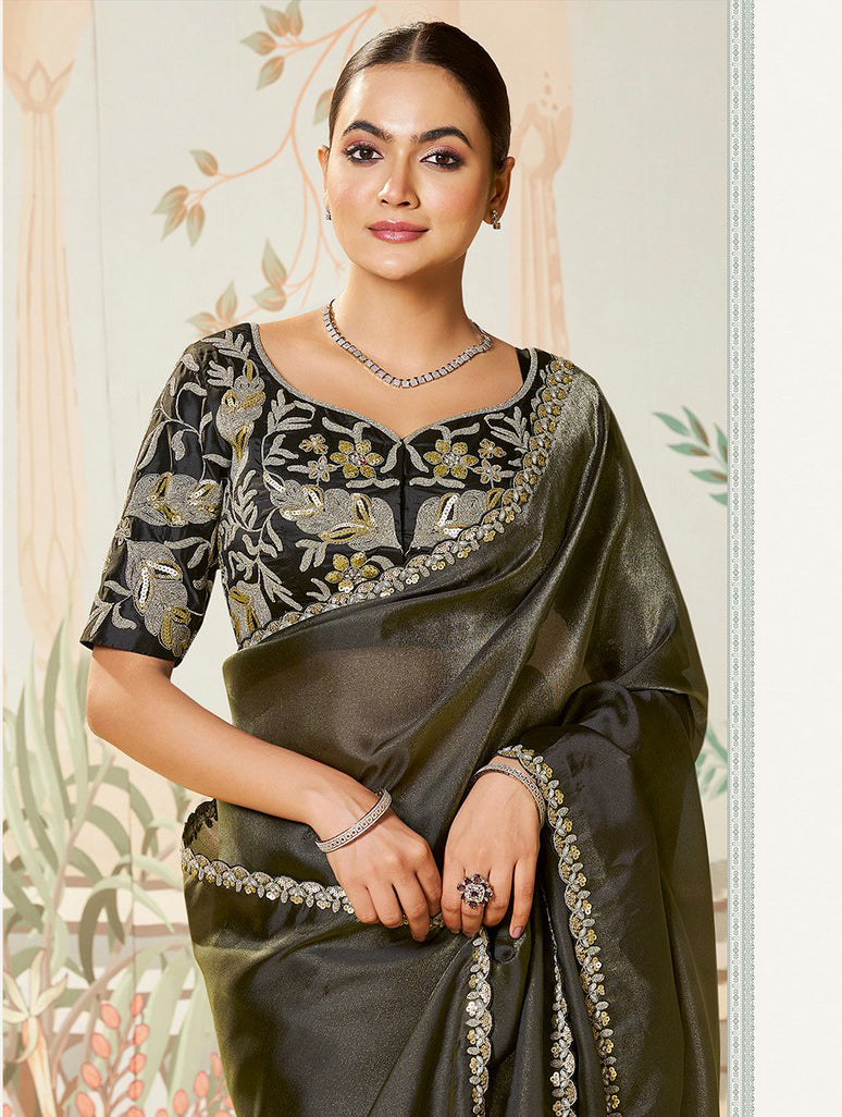 Look Attractive These Designer Party Wear Fancy Saree in Fine Colored.These Saree Are Jari Organza Silk And Blouse Two Tone Satin Silk is Fabricated.Its Beautified Fancy Dual Sequance Embroidery Work.