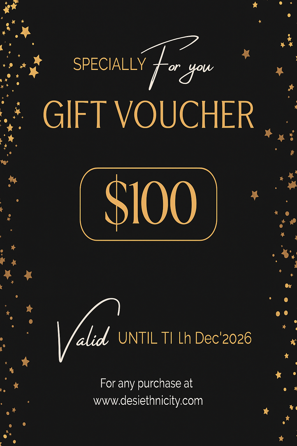 Buy any product across www.desiethnicity.com and use the gift voucher worth US$ 100 at check out.