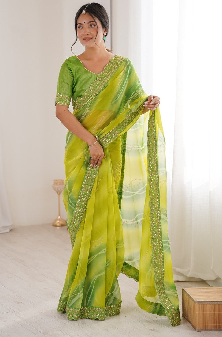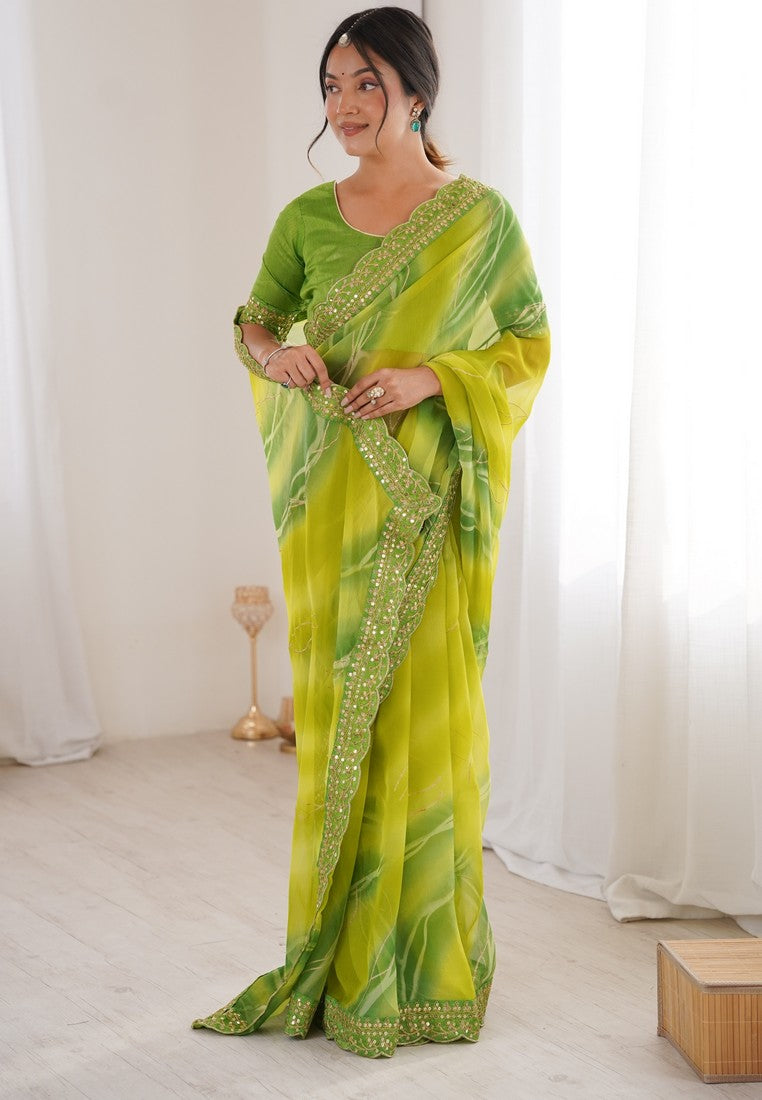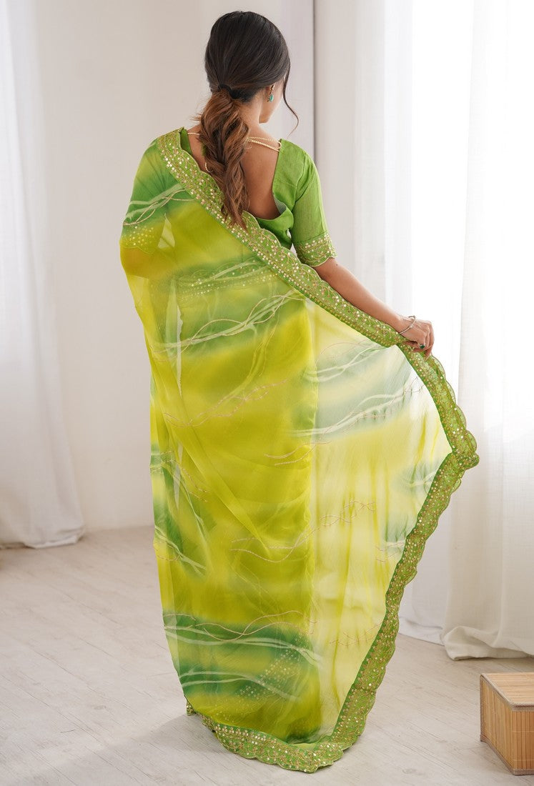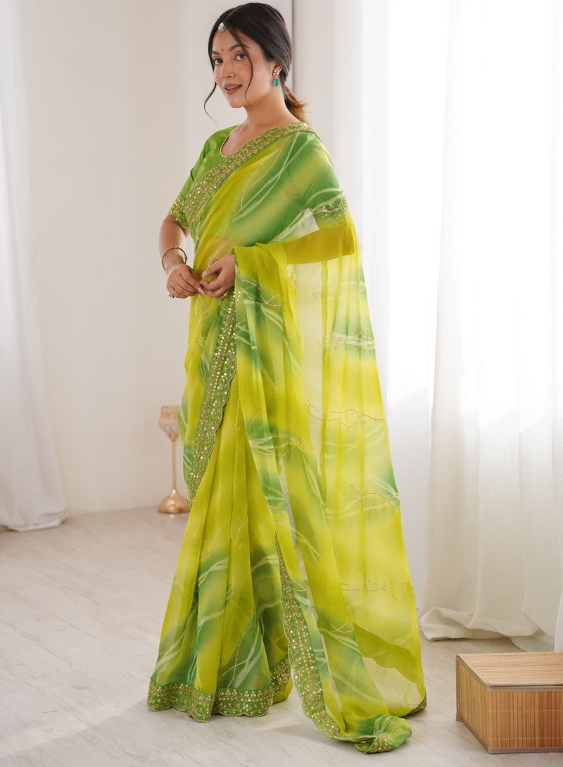 Attractive These Party Wear Saree in Fine Colored.These Saree Are Georgette Chiffon And Blouse is Banglori Fabricated.Its Beautified With Designer Pedding Laheriya Gold Foil Printed With Embroidery Work Lace Border.