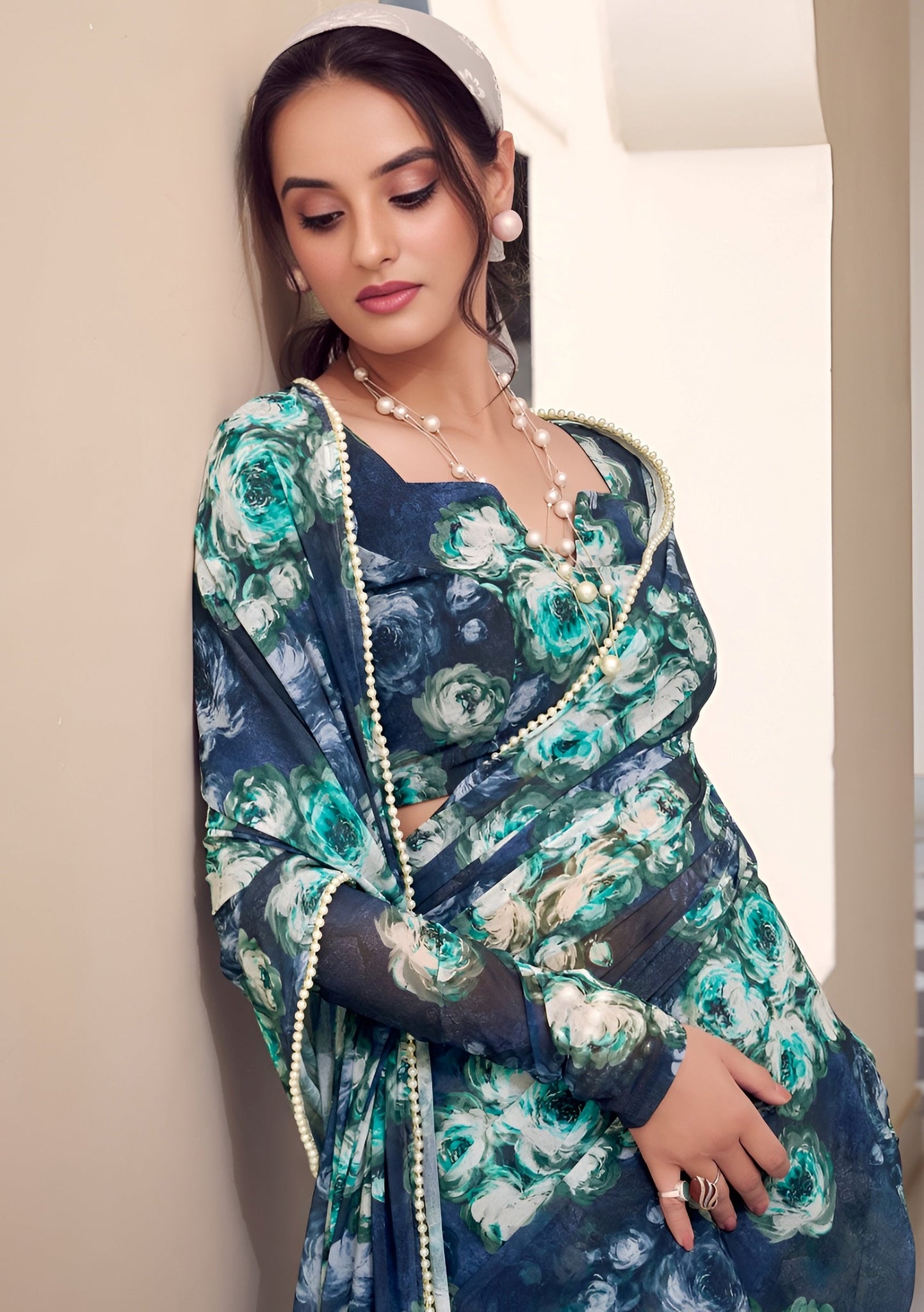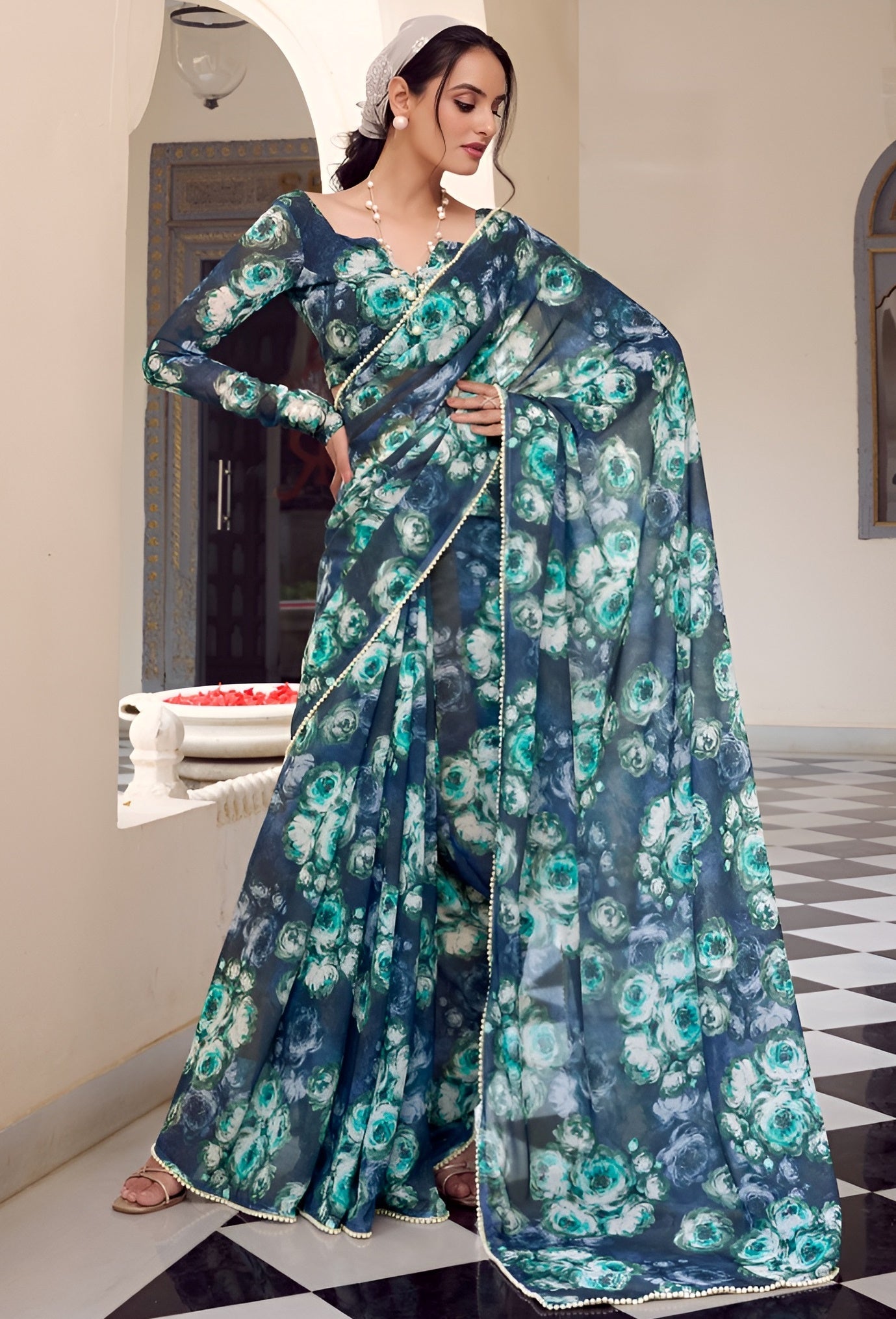 Beautiful Teal Color Georgette Fabric Casual Saree