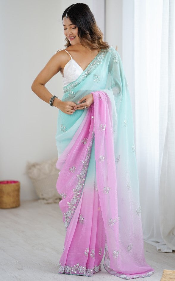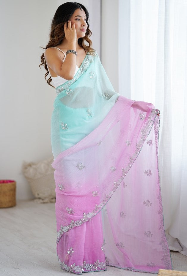 Looking These Casual Wear Saree in Fine Colored. These Saree Are Chiffon Crush And Blouse is Ultra Stin Fabricated. Its Beautified With Designer Sequance,Moti,Cte Dana Embroidery Work.