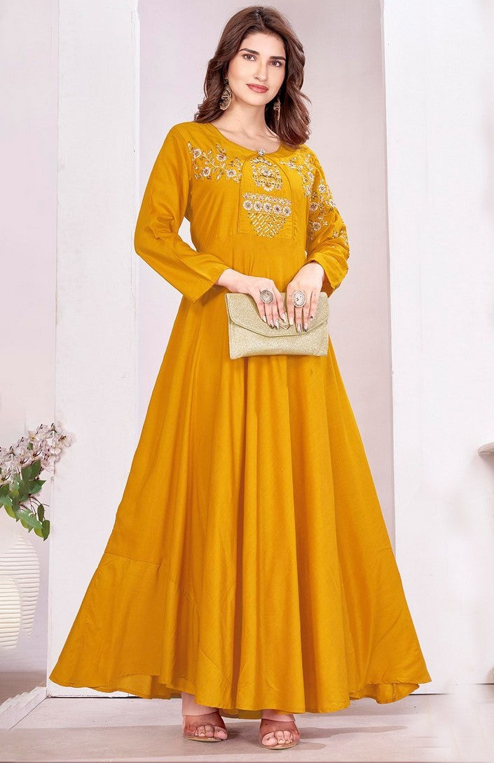 Grab These Beautiful Looking Readymade Gown.These Gown is Fabricated On Muslin. Its Beautified With Designer Embroidery Work.