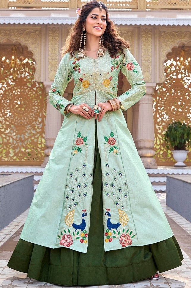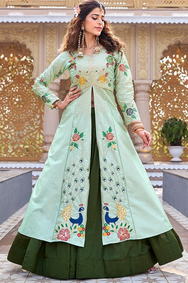 Magnetic Green Color Satin Fabric Designer Lehenga