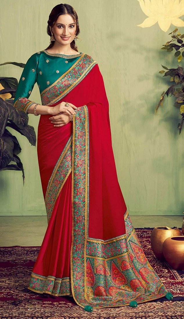 Glowing Red Color Satin Fabric Designer Saree
