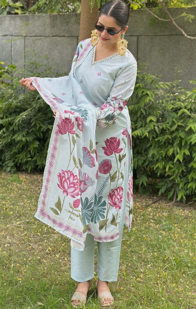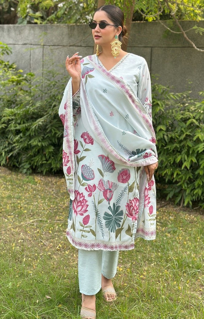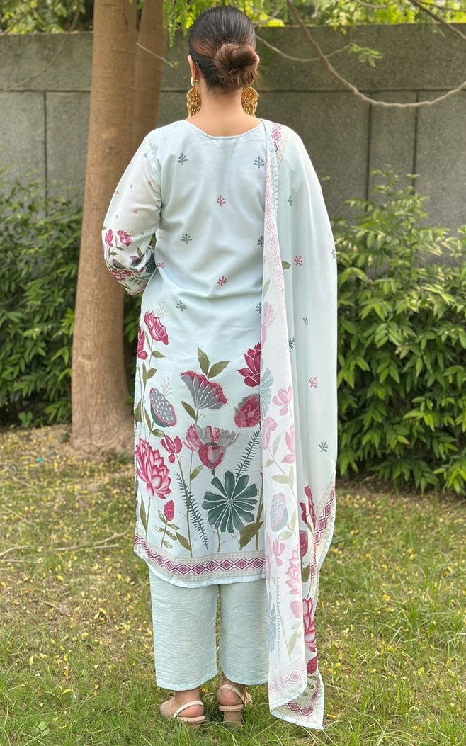 Beautiful Aqua Color Silk Fabric Designer Suit