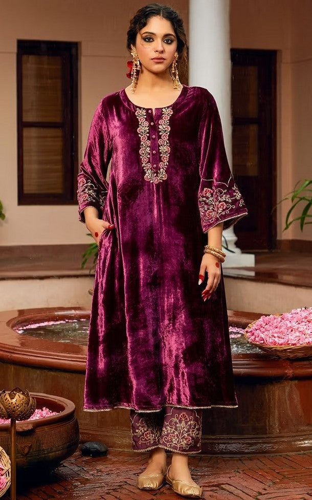 Beautiful Maroon Color Velvet Fabric Designer Suit
