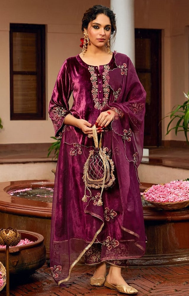 | Fabric | Top Fabric - Velvet,Bottom Fabric - Velvet,Dupatta Fabric - Organza |