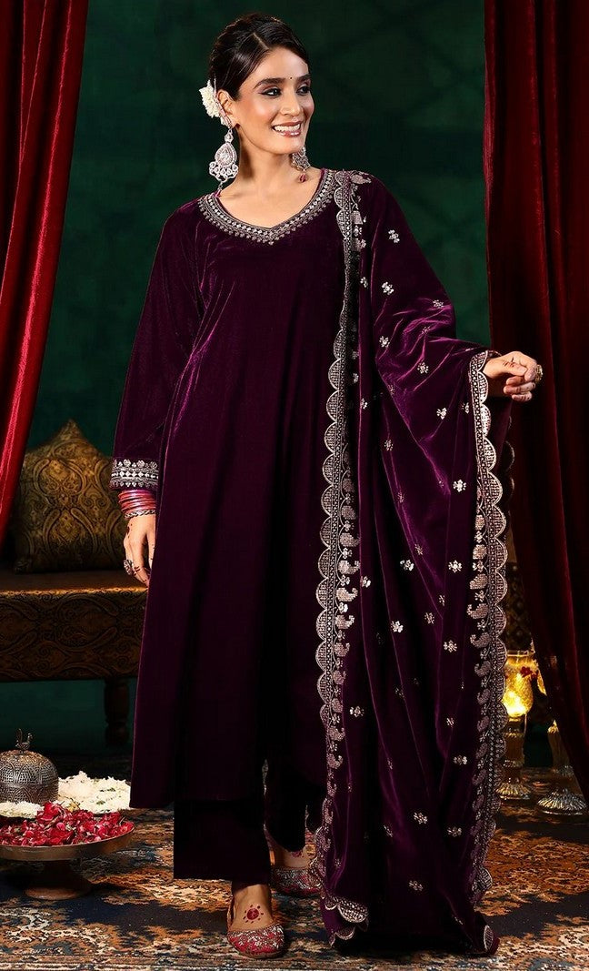 Beautiful Voilet Color Velvet Fabric Designer Suit