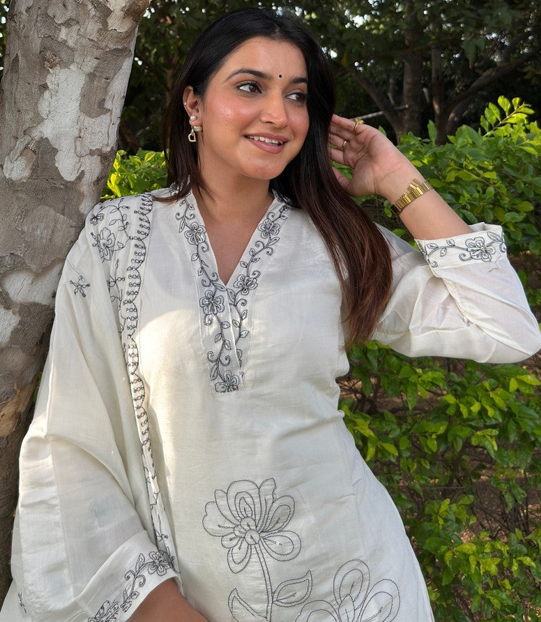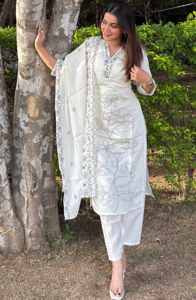 Beautiful White Color Silk Fabric Designer Suit