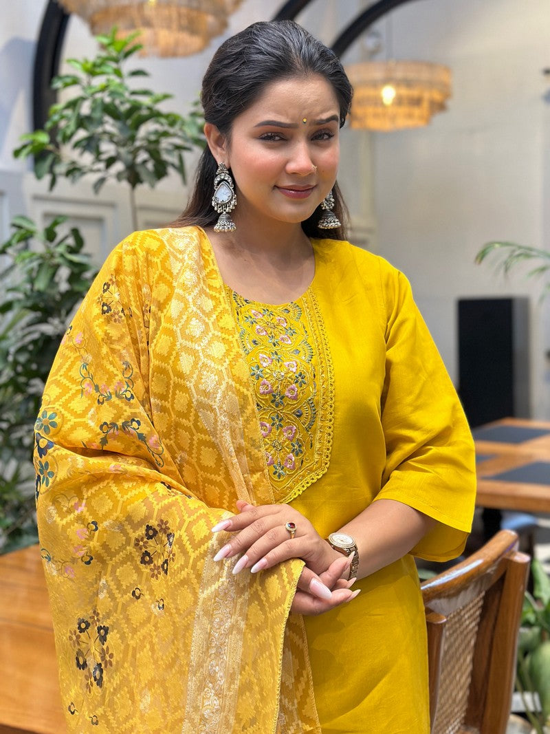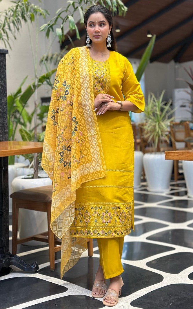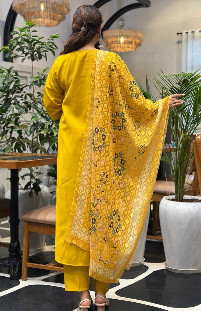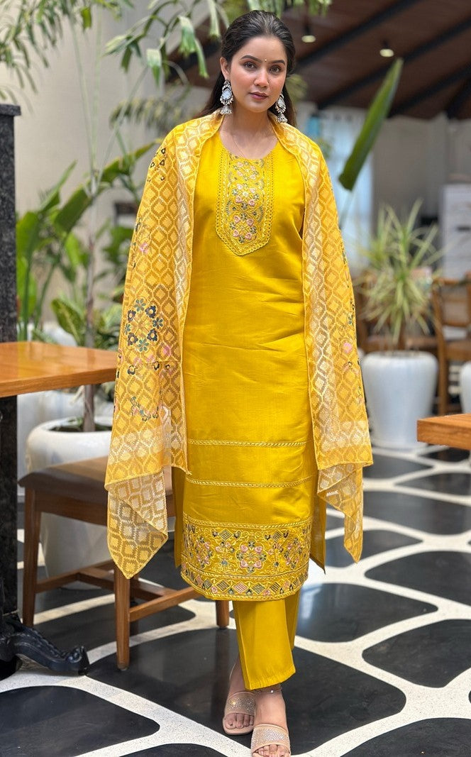 Beautiful Yellow Color Silk Fabric Designer Suit