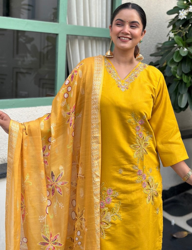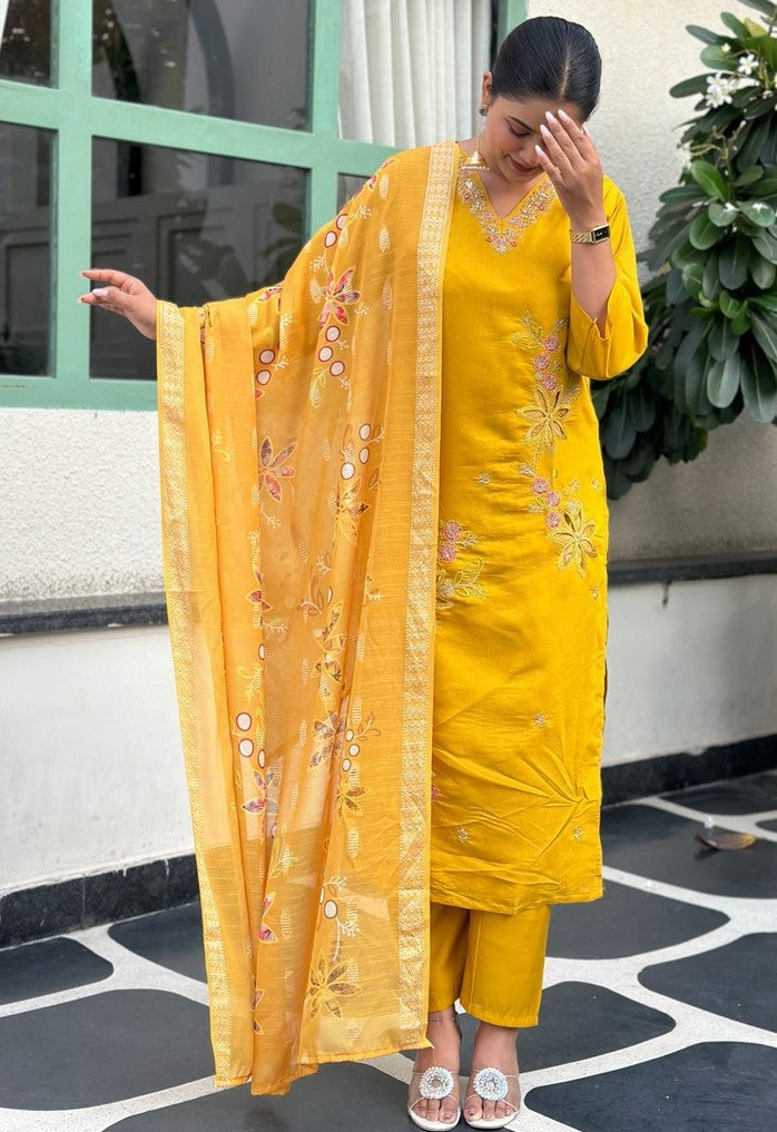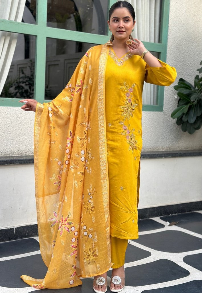 Beautiful Yellow Color Silk Fabric Designer Suit