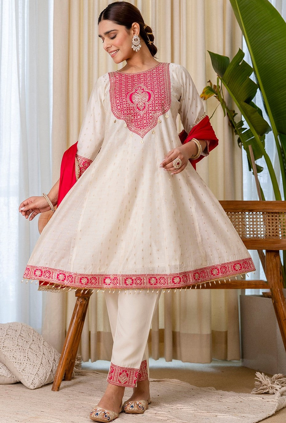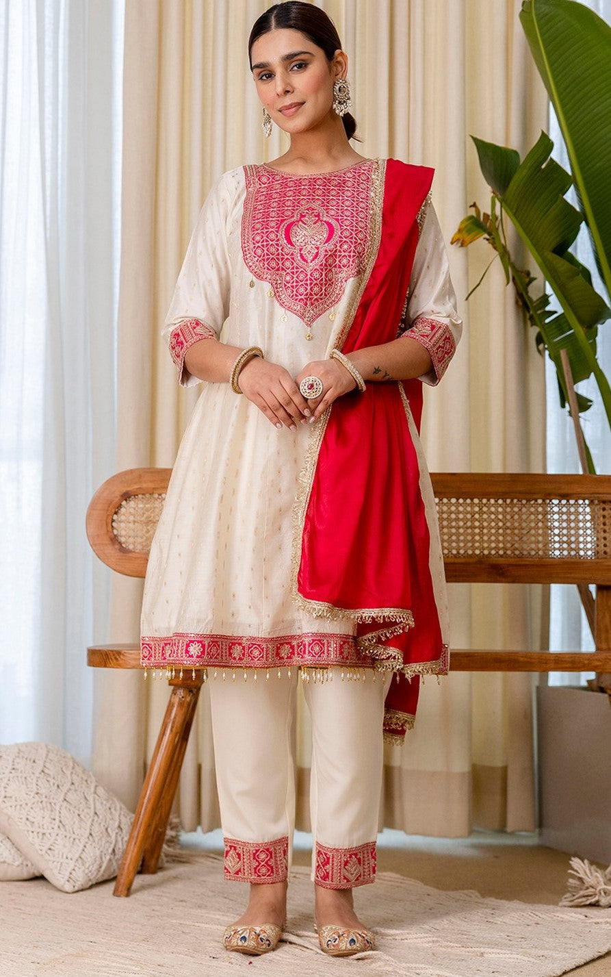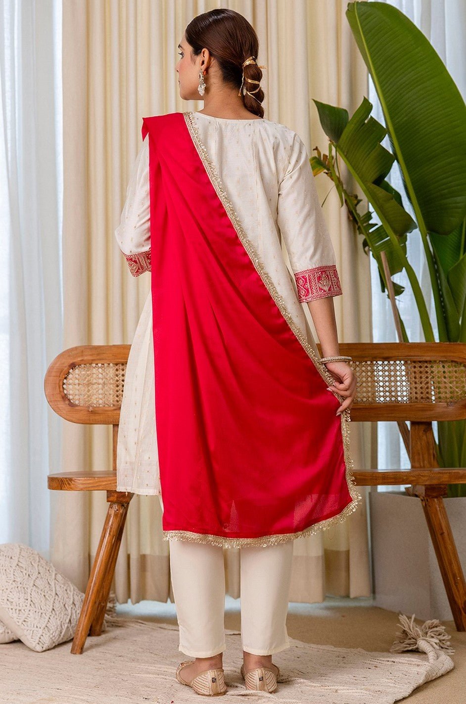 | Color | Top Color - Cream, Bottom Color - Cream, Dupatta Color - Red |