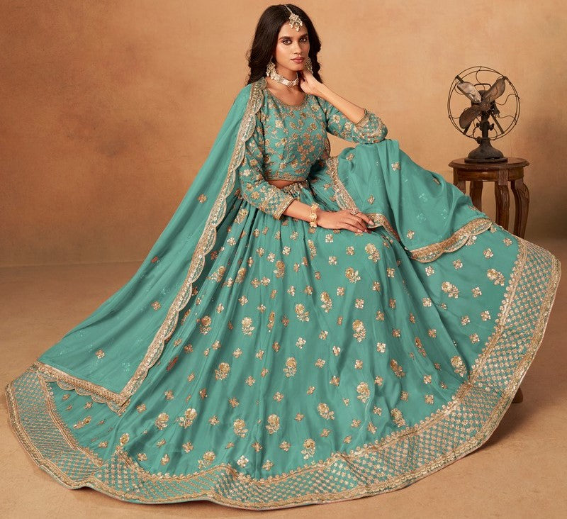 Amazing Turquoise Color Organza Fabric Party Wear Lehenga