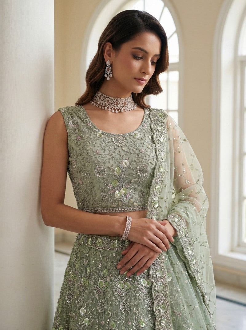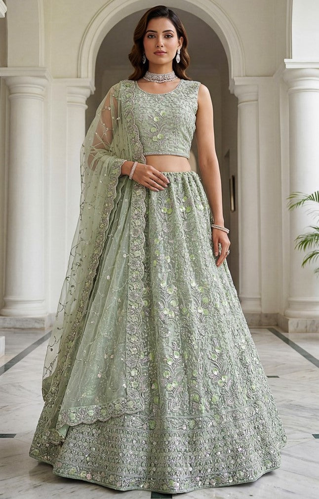 Elegant Green Color Net Fabric Party Wear Lehenga