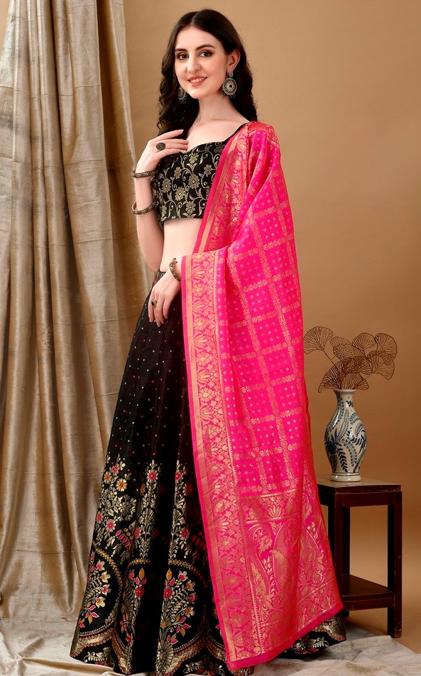Glowing Black Color Jacquard Fabric Party Wear Lehenga