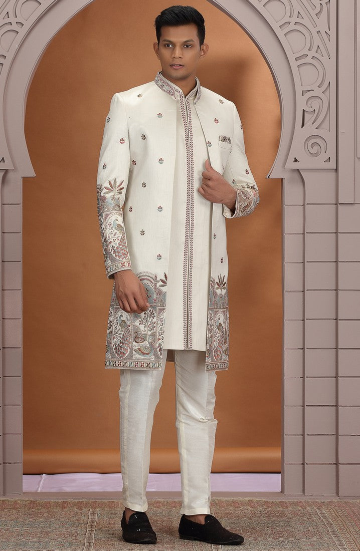 Elegant Cream Color Art Silk Fabric Mens Indowestern