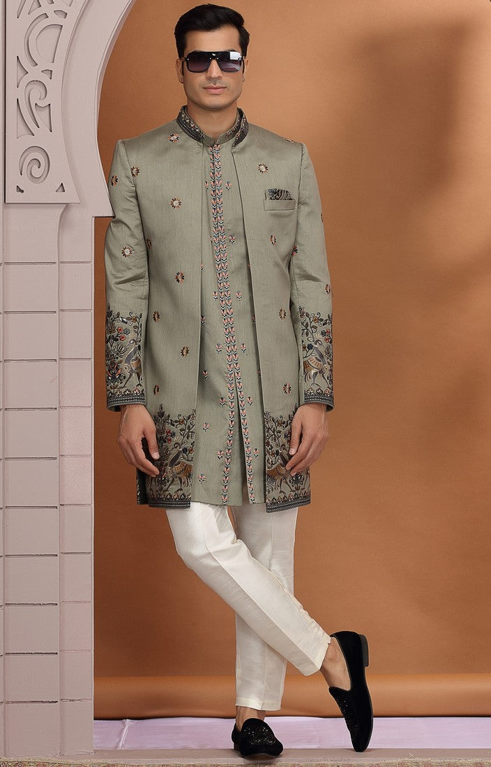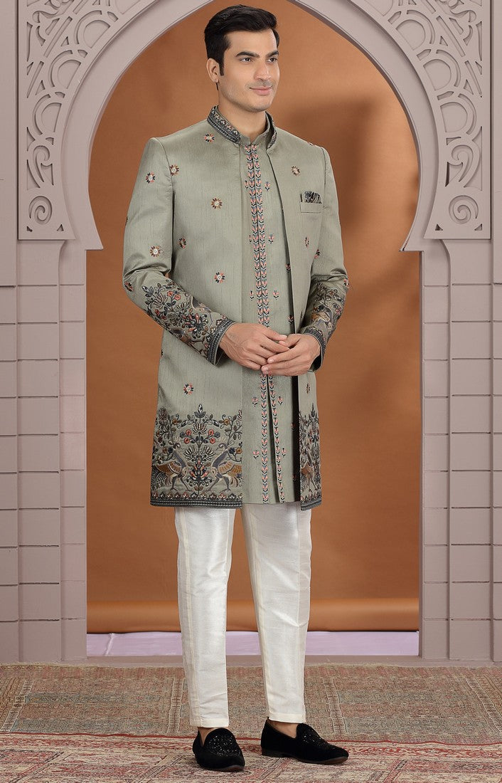 Elegant Green Color Art Silk Fabric Mens Indowestern