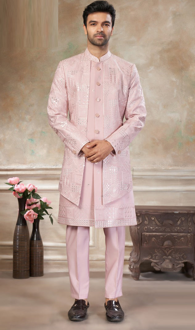 Elegant Pink Color Silk Fabric Mens Indowestern