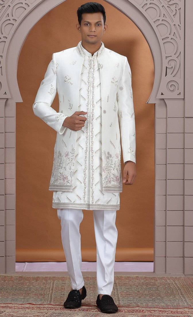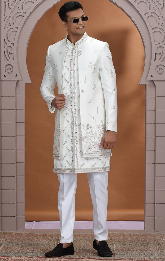 Elegant White Color Art Silk Fabric Mens Indowestern