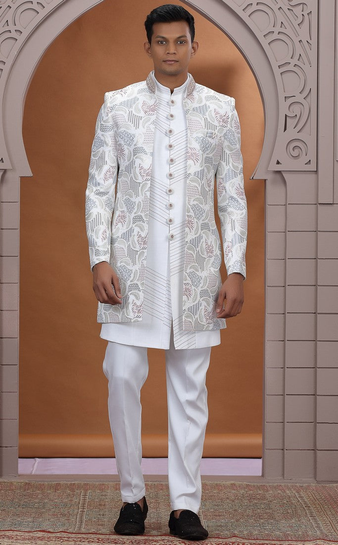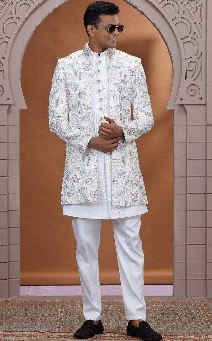 Elegant White Color Art Silk Fabric Mens Indowestern