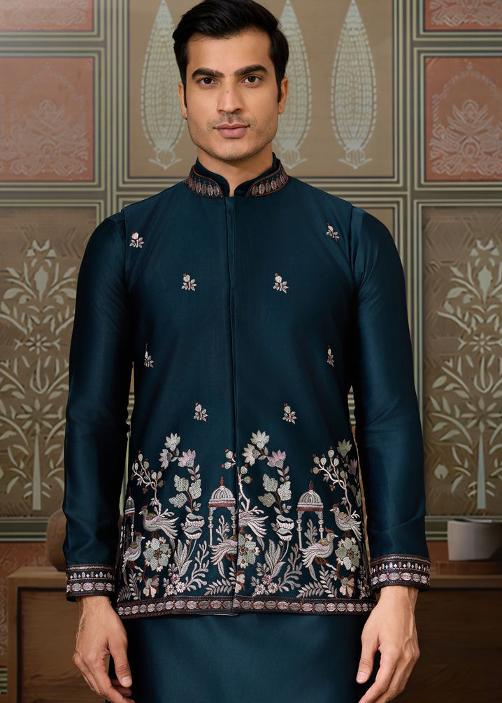 Grand Teal Color Silk Fabric Kurta Pajama and Jacket