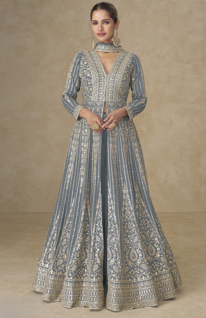 Amazing Grey Color Chinon Fabric Partywear Suit