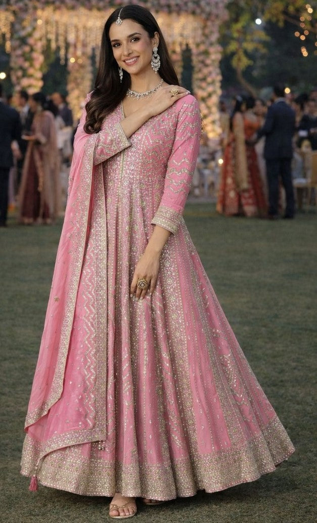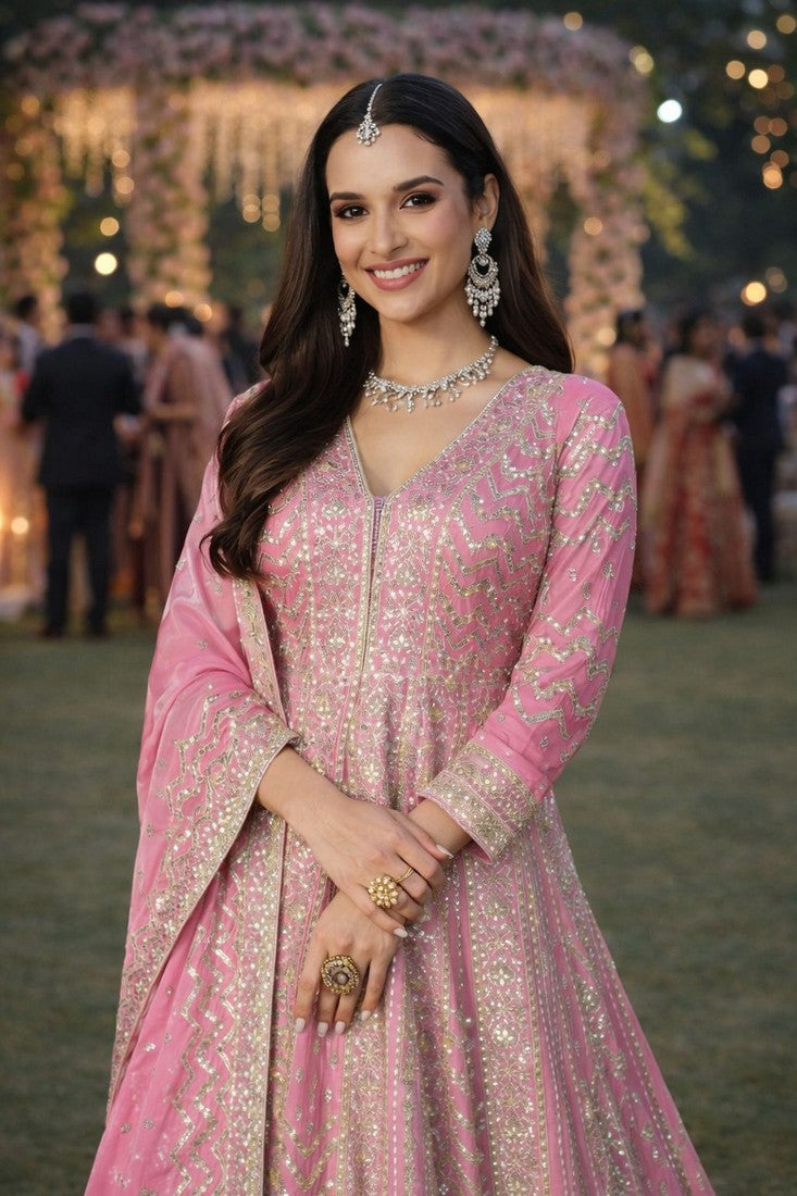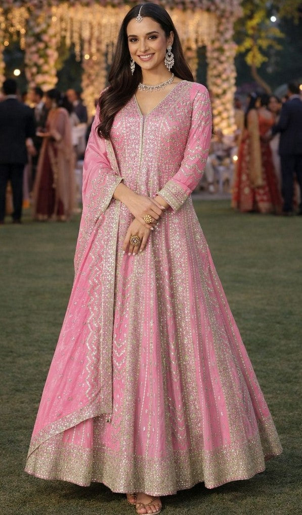 Beautiful Pink Color Chinon Fabric Partywear Suit