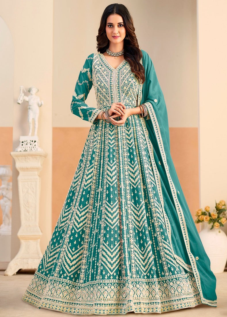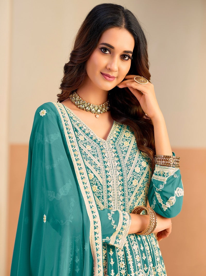 Beautiful Teal Color Georgette Fabric Partywear Suit