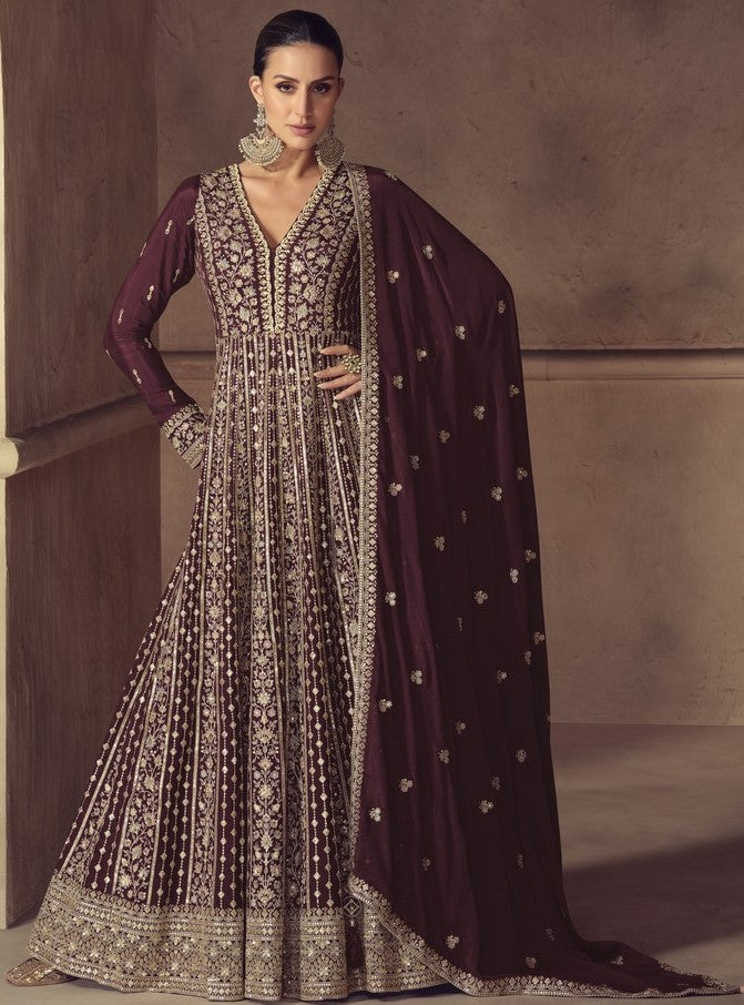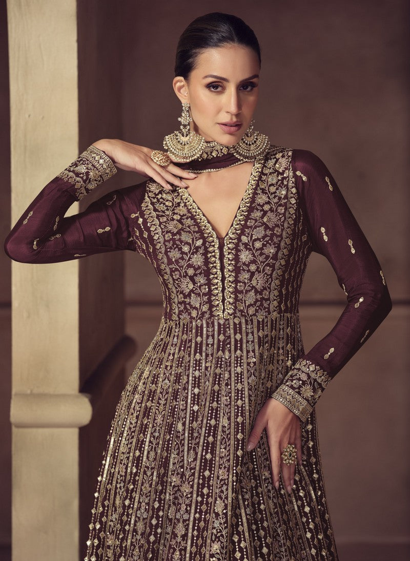 Tasteful Brown Color Chinon Fabric Partywear Suit
