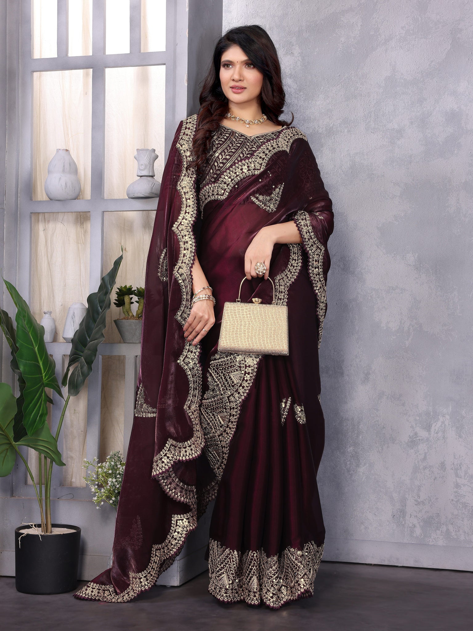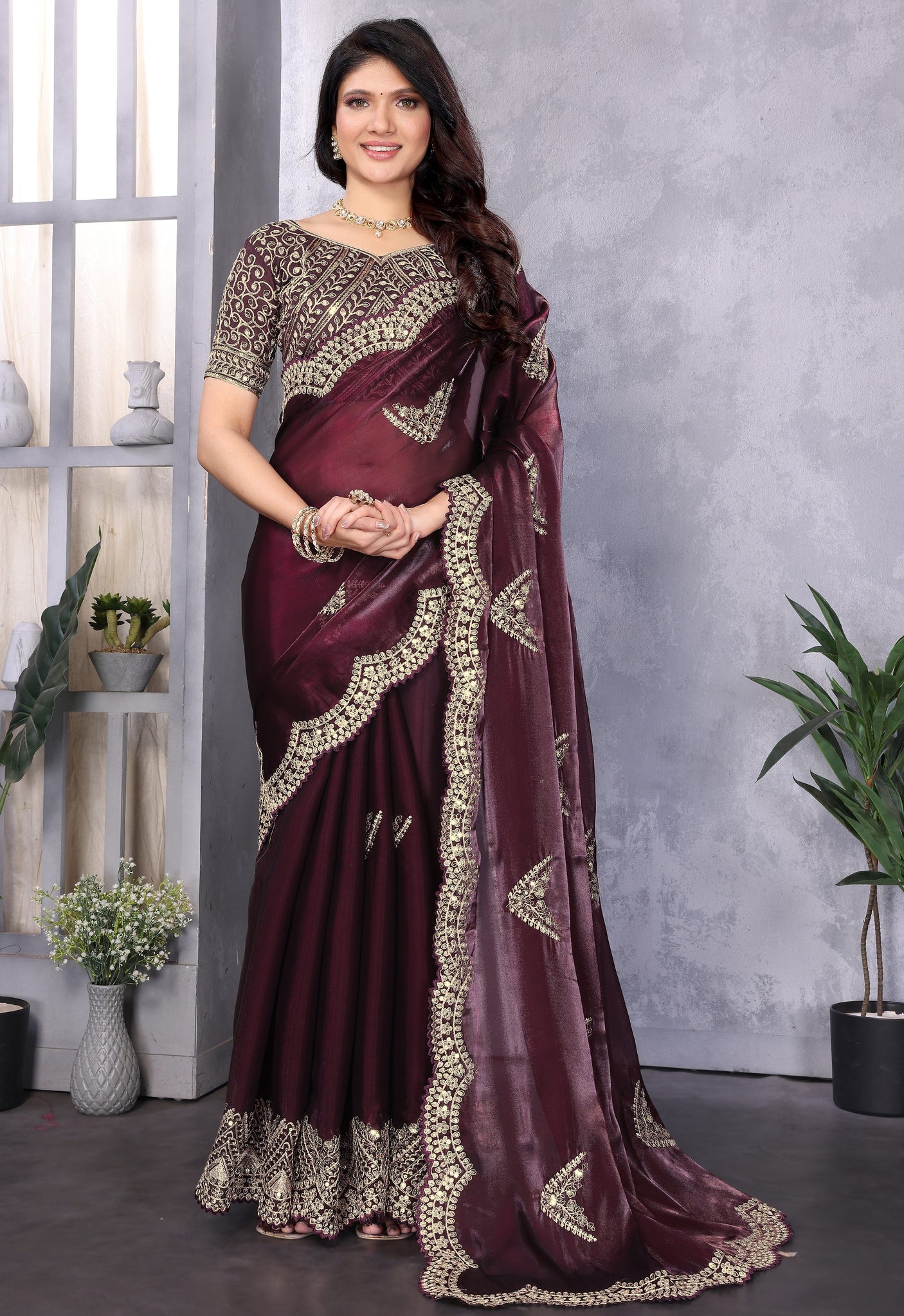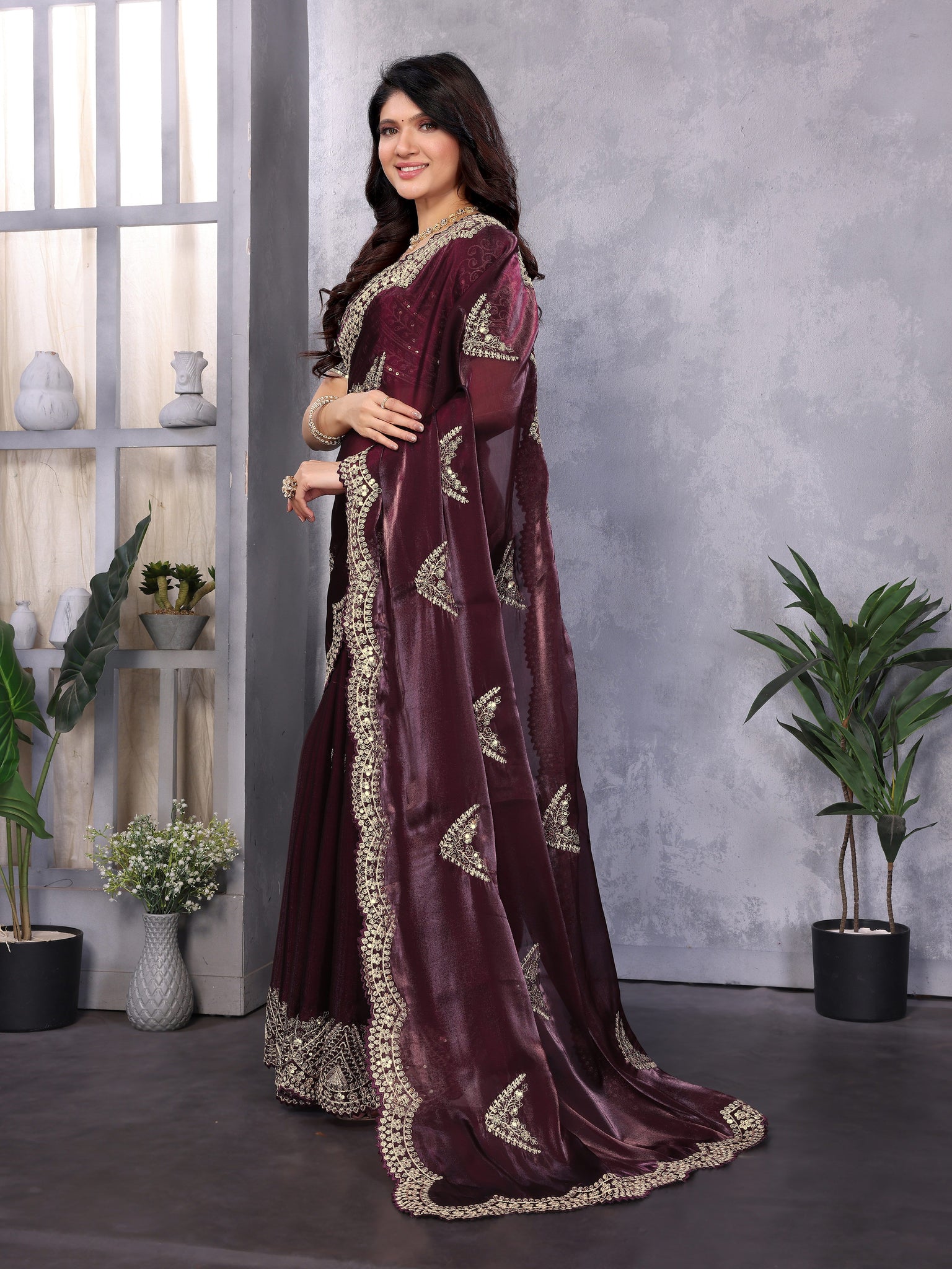 Beauteous Maroon Color Shimmer Fabric Partywear Saree
