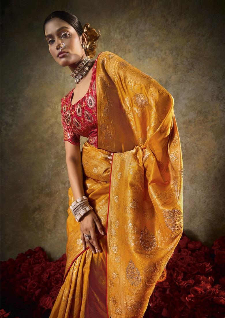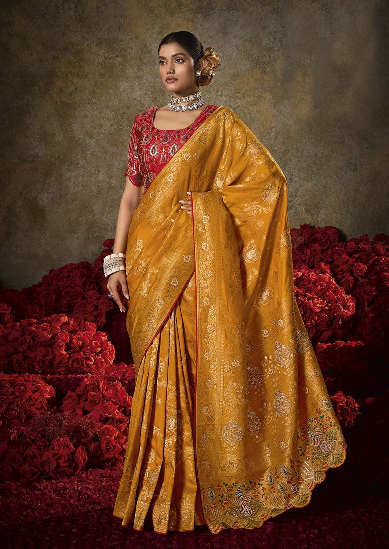 Beautiful Mustard Color Silk Fabric Partywear Saree