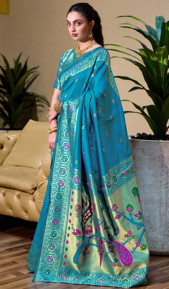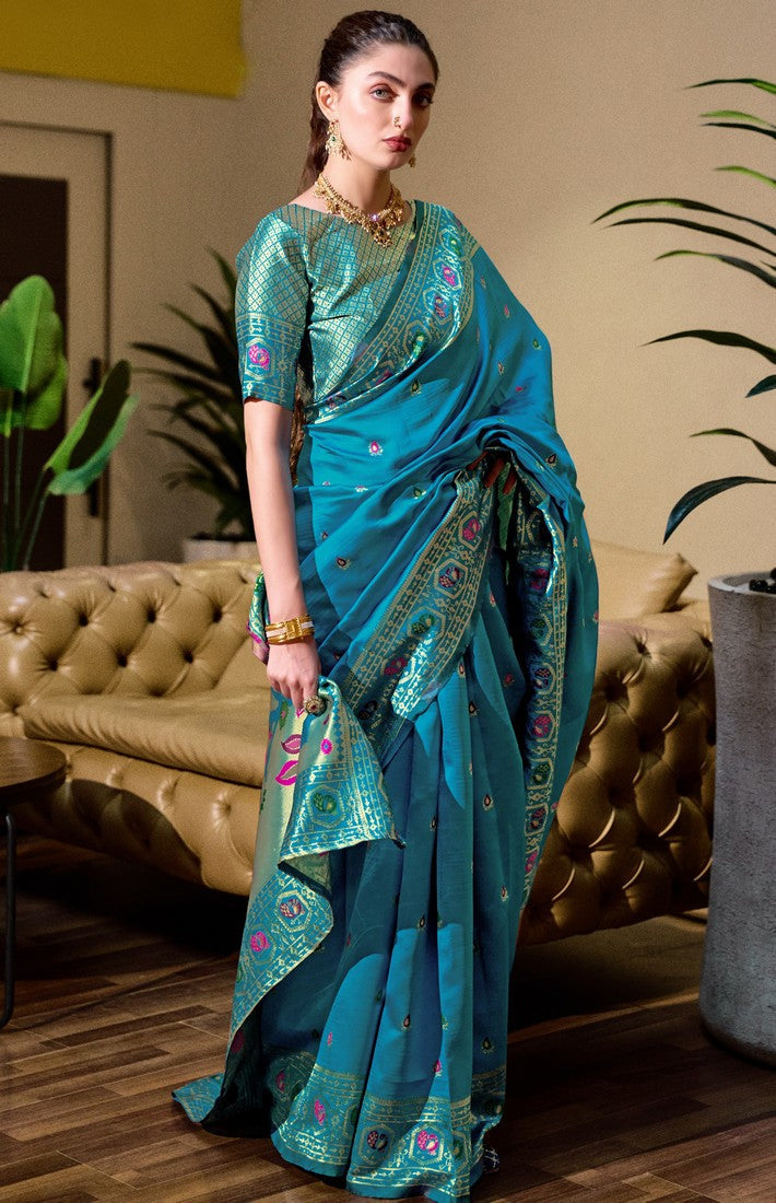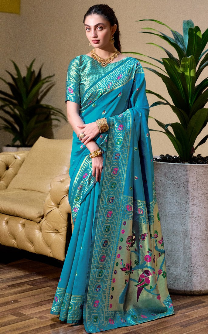 Beautiful Turquoise Color Silk Fabric Partywear Saree
