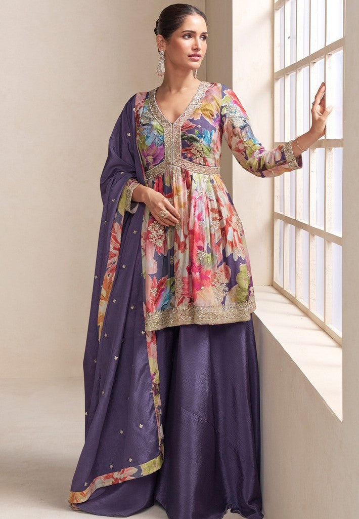Amazing Multi Color Chinon Fabric Plazzo Suit