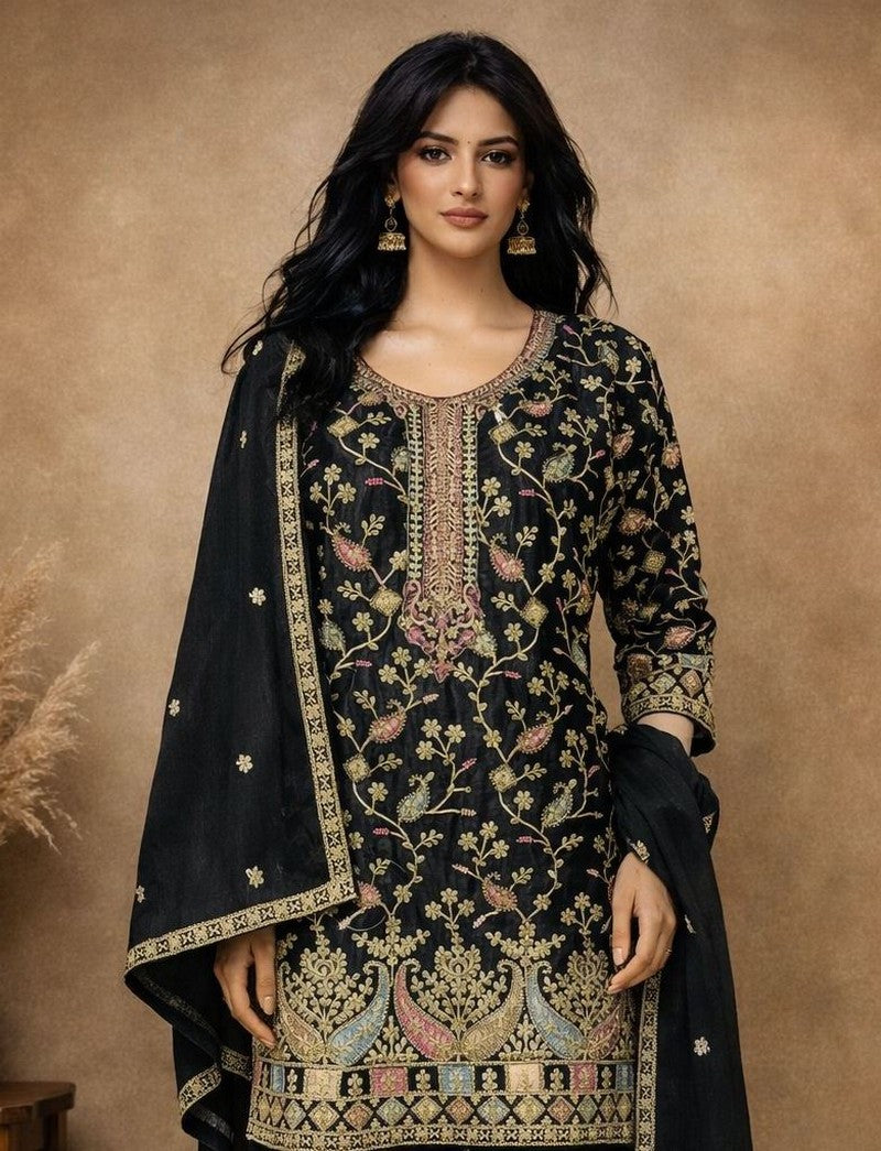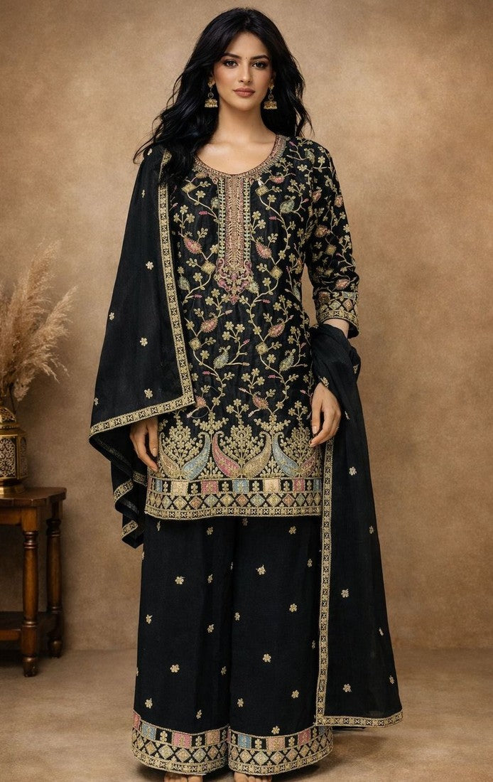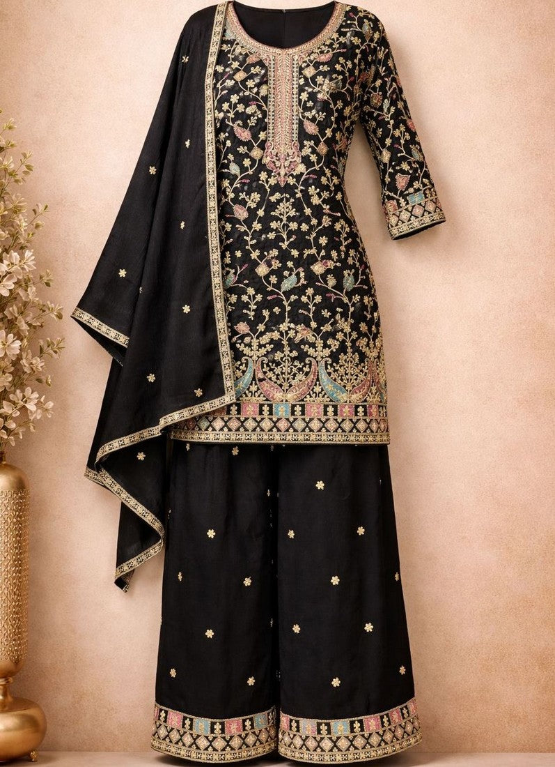 Beautiful Black Color Chinon Fabric Plazzo Suit