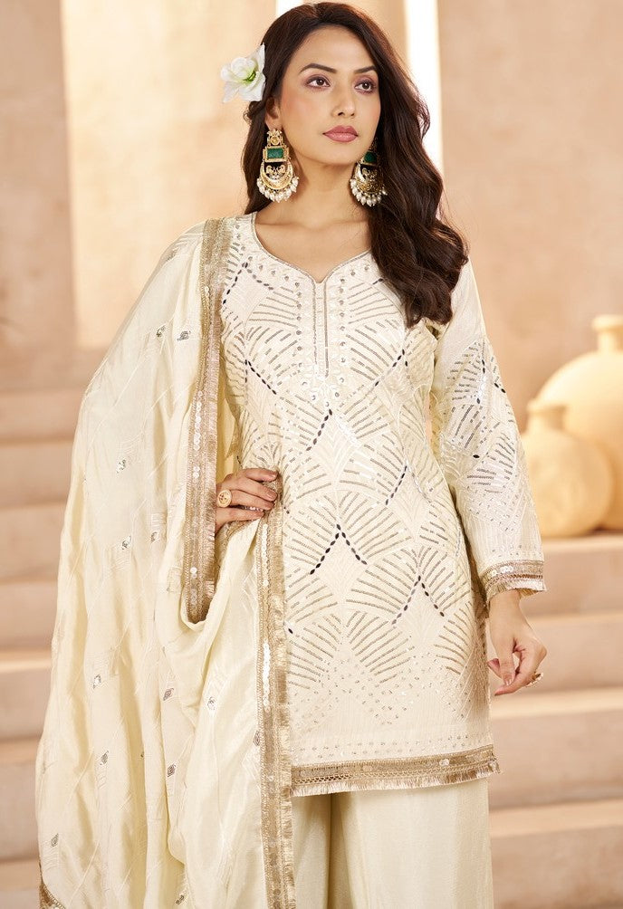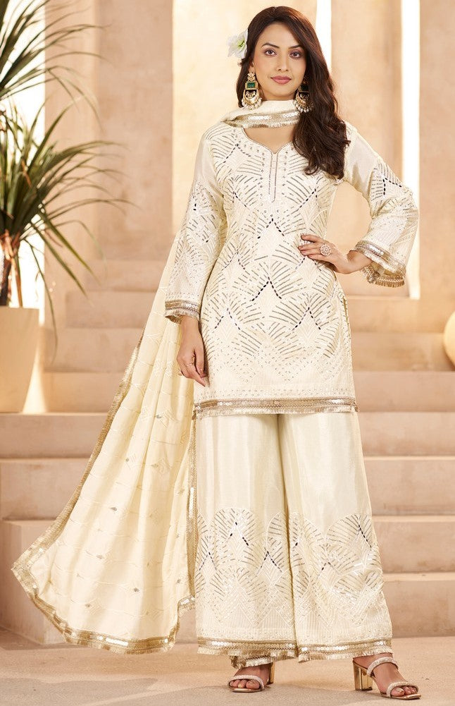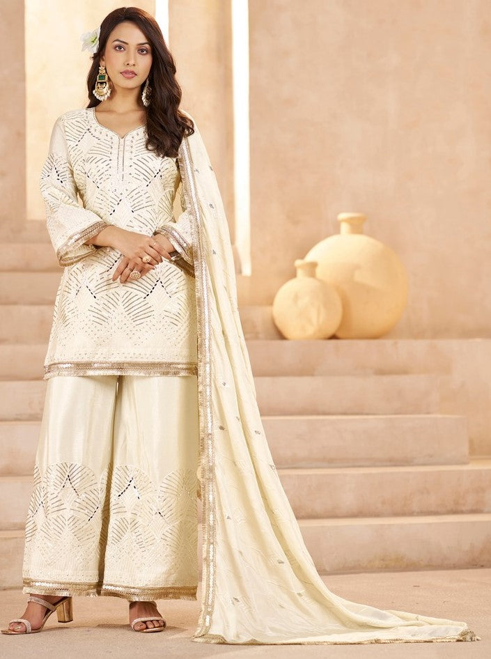 Beautiful Cream Color Chinon Fabric Plazzo Suit