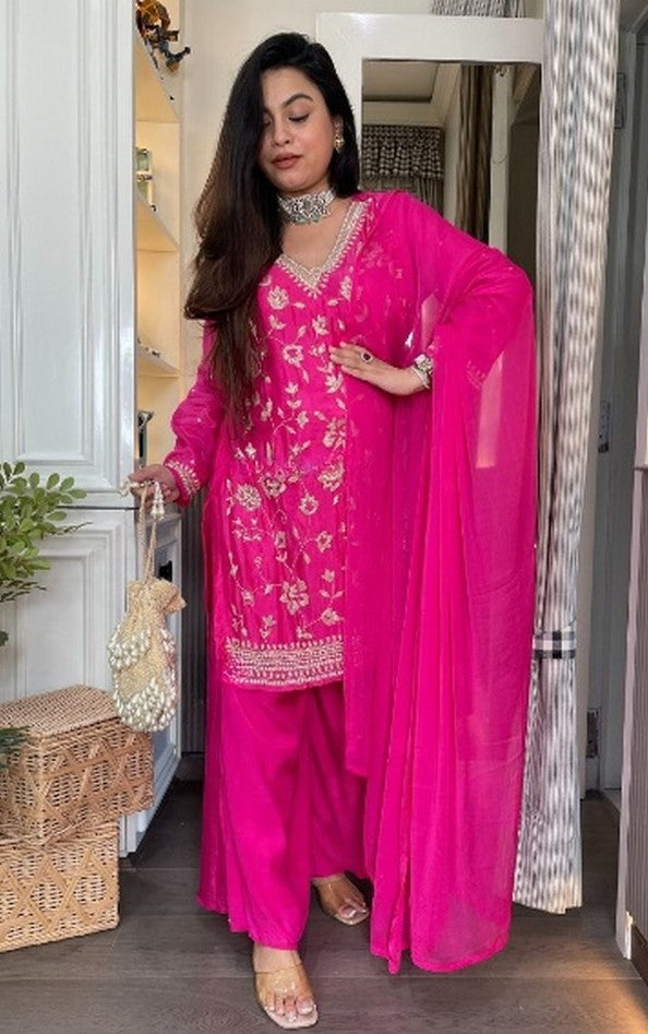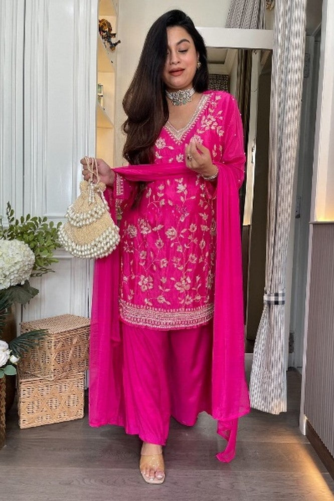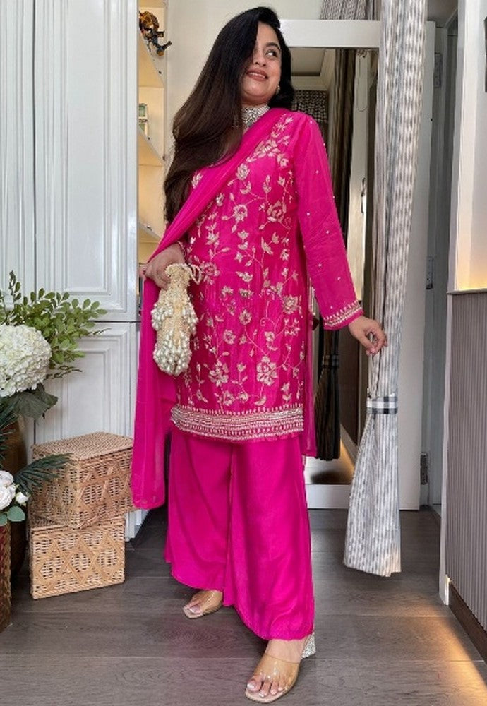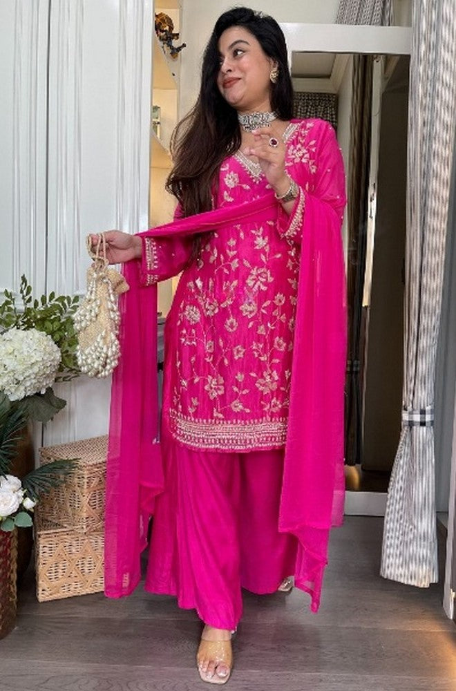 Beautiful Pink Color Chinon Fabric Plazzo Suit