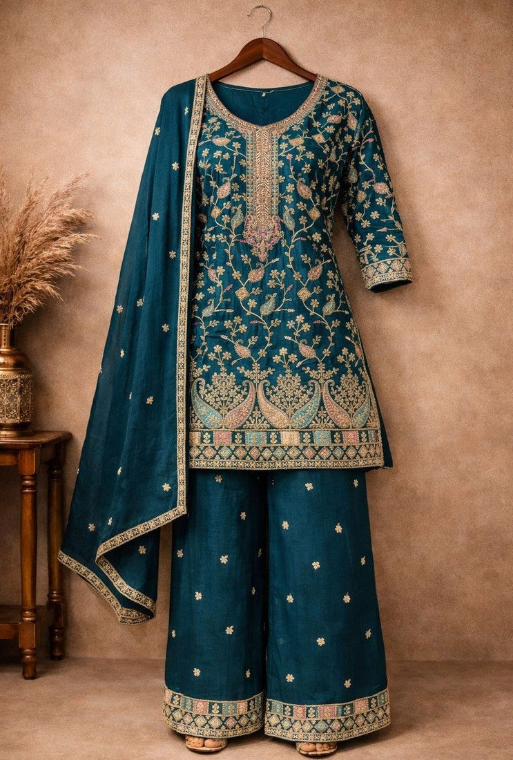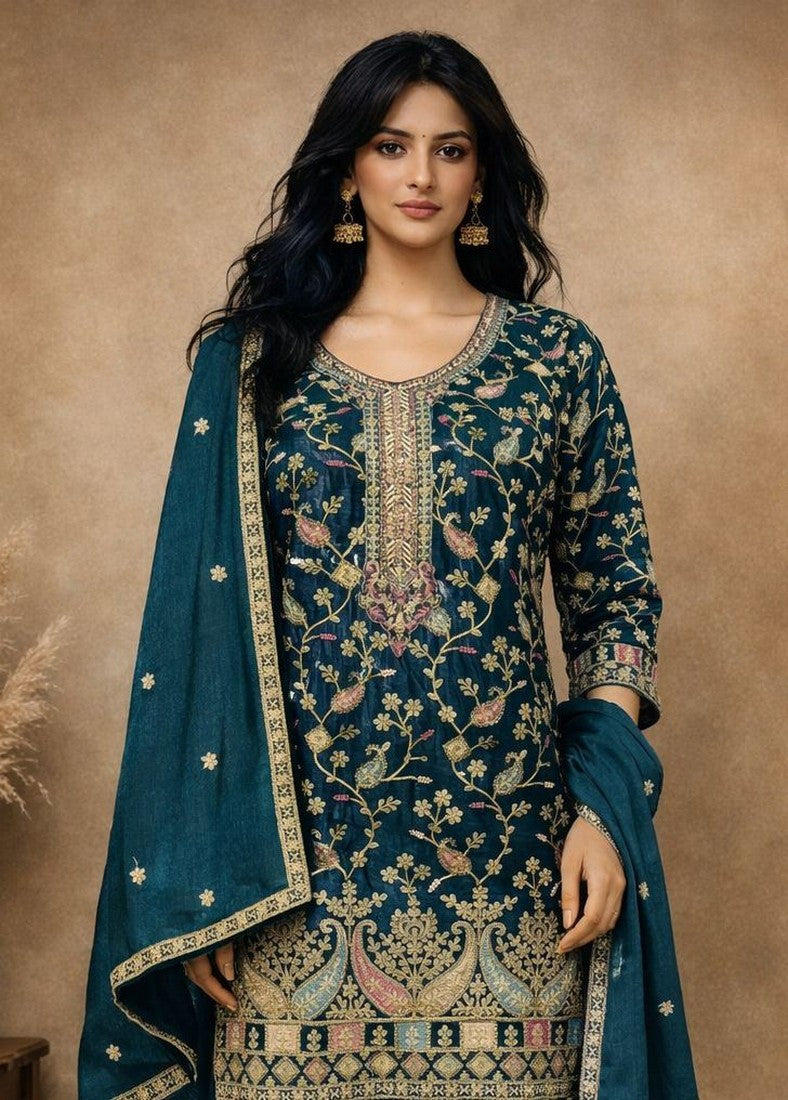 Beautiful Teal Color Chinon Fabric Plazzo Suit