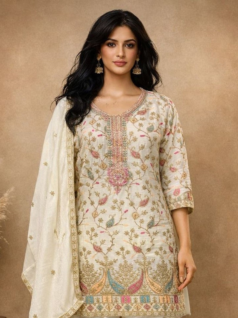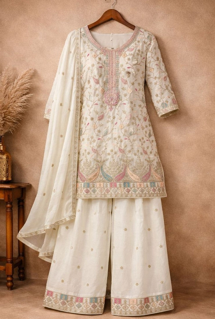 Beautiful White Color Chinon Fabric Plazzo Suit