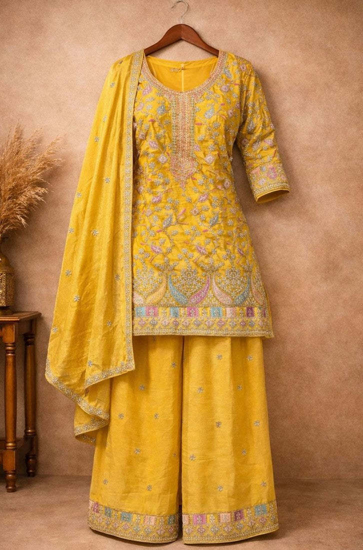Beautiful Yellow Color Chinon Fabric Plazzo Suit