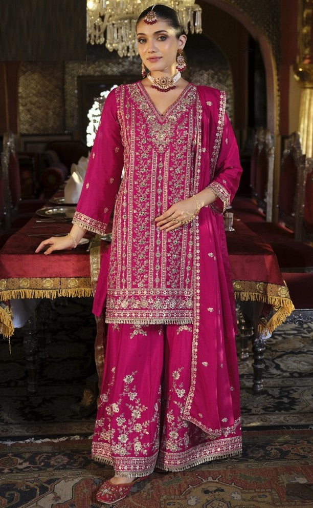 Striking Pink Color Chinon Fabric Plazzo Suit