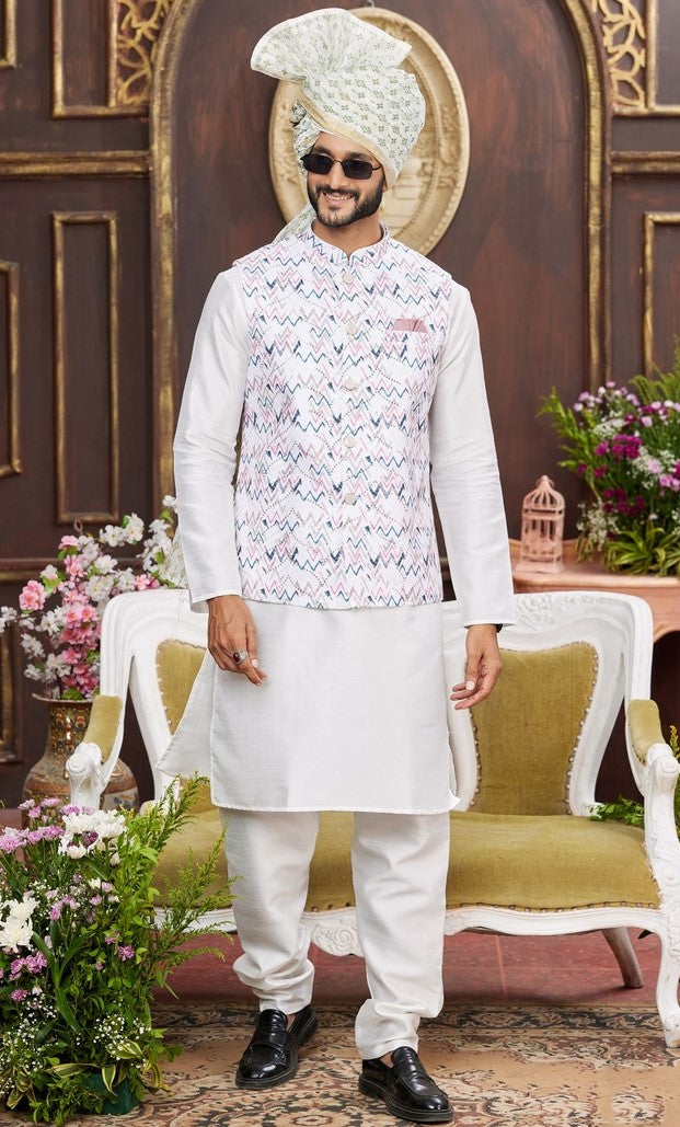 Amazing White Color Art Silk Fabric Kurta Pajama and Jacket
