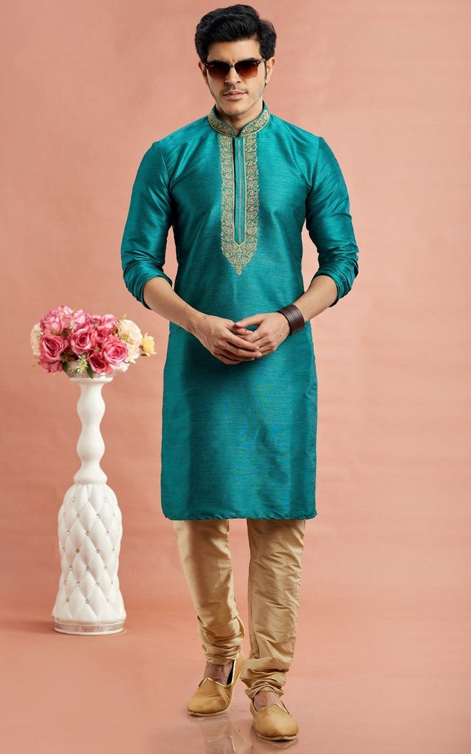 Fabulous Teal Color Silk Fabric Kurta Pajama