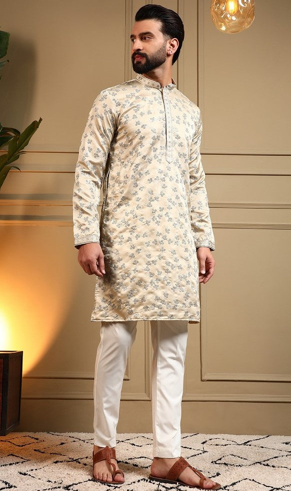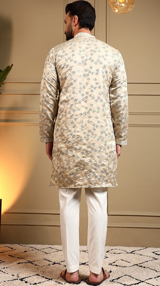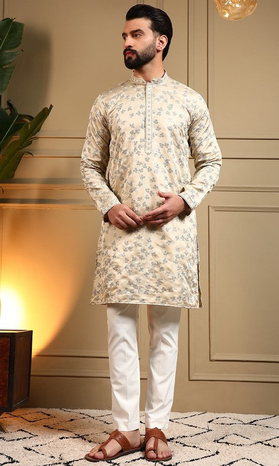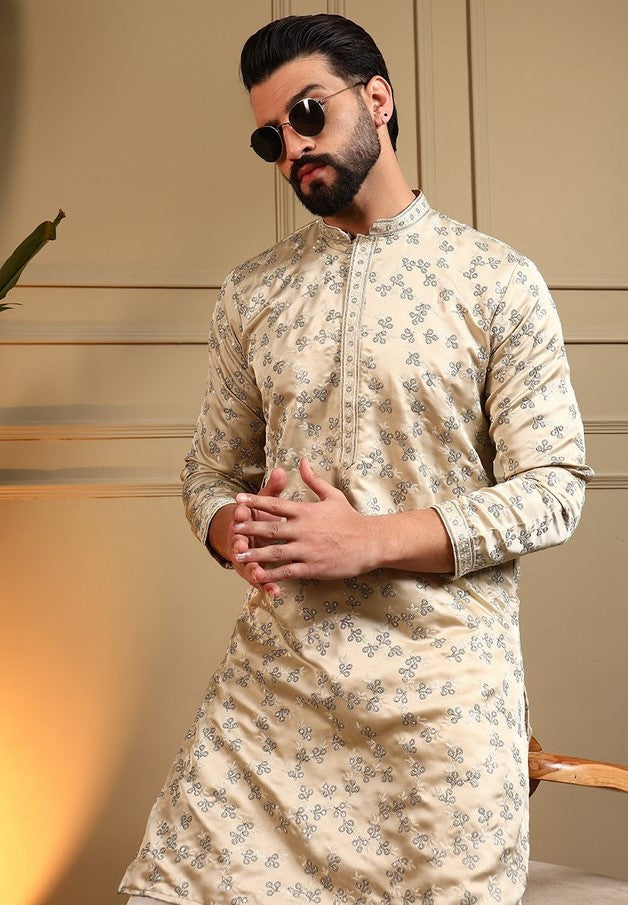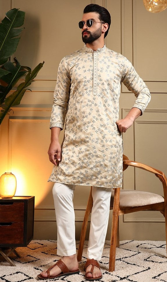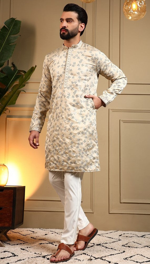 Grand Cream Color Silk Fabric Kurta Pajama