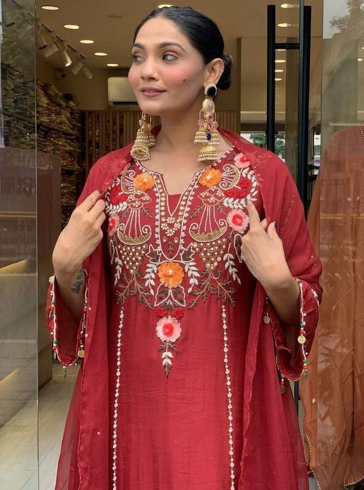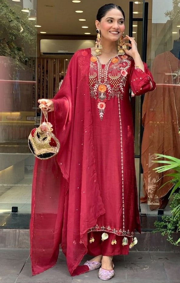 Beautiful Maroon Color Chanderi Fabric Designer Suit