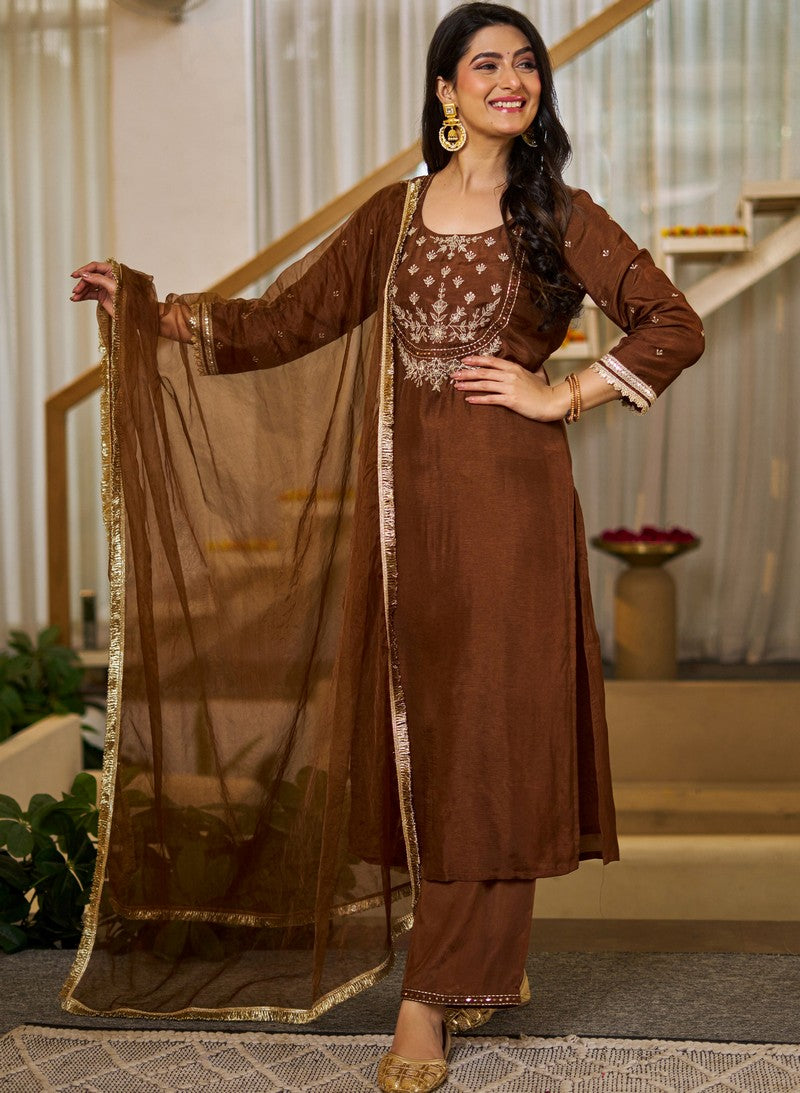 Pretty Brown Color Vichitra Fabric Designer Suit
