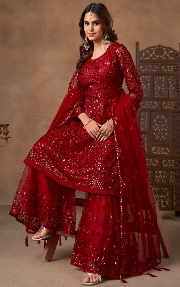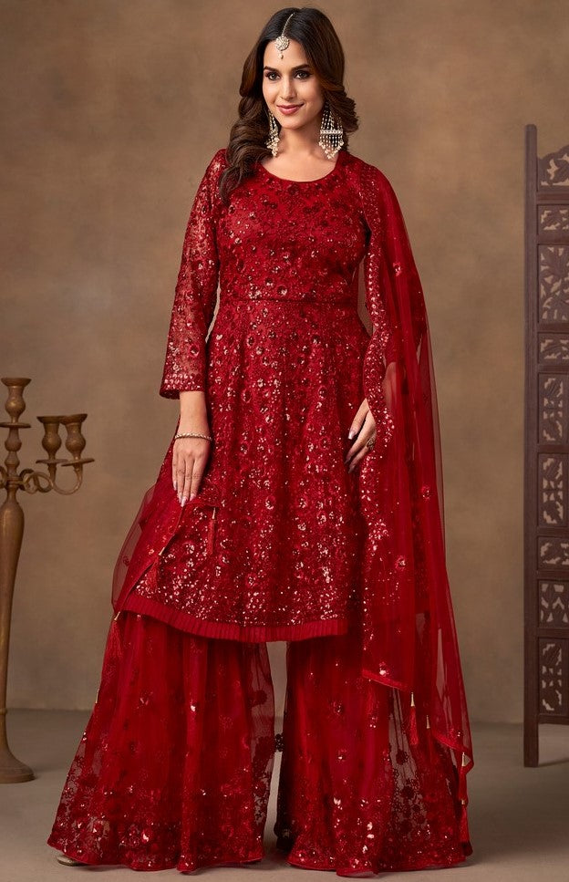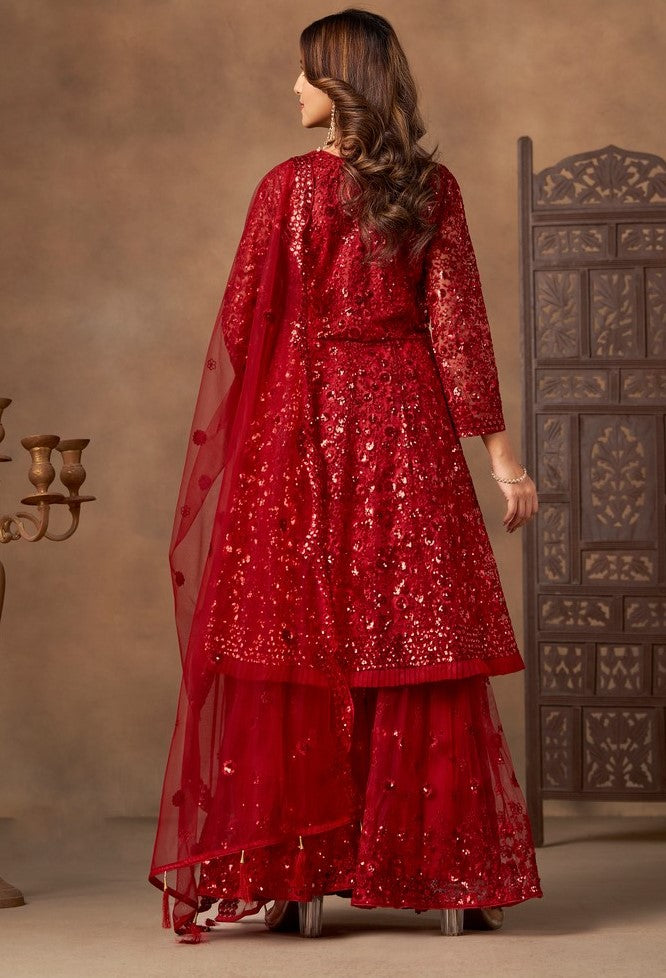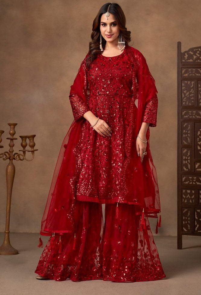 Beautiful Red Color Net Fabric Sharara Suit