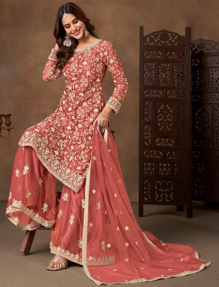 Looking These Beautiful Party Wear Fine Color Plazzo Suits.These Top Are Net And Dupatta Are Net And Bottom Net Fabricated.Its Beautified With Designer Sequance Embroidery Work.