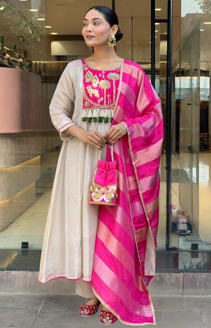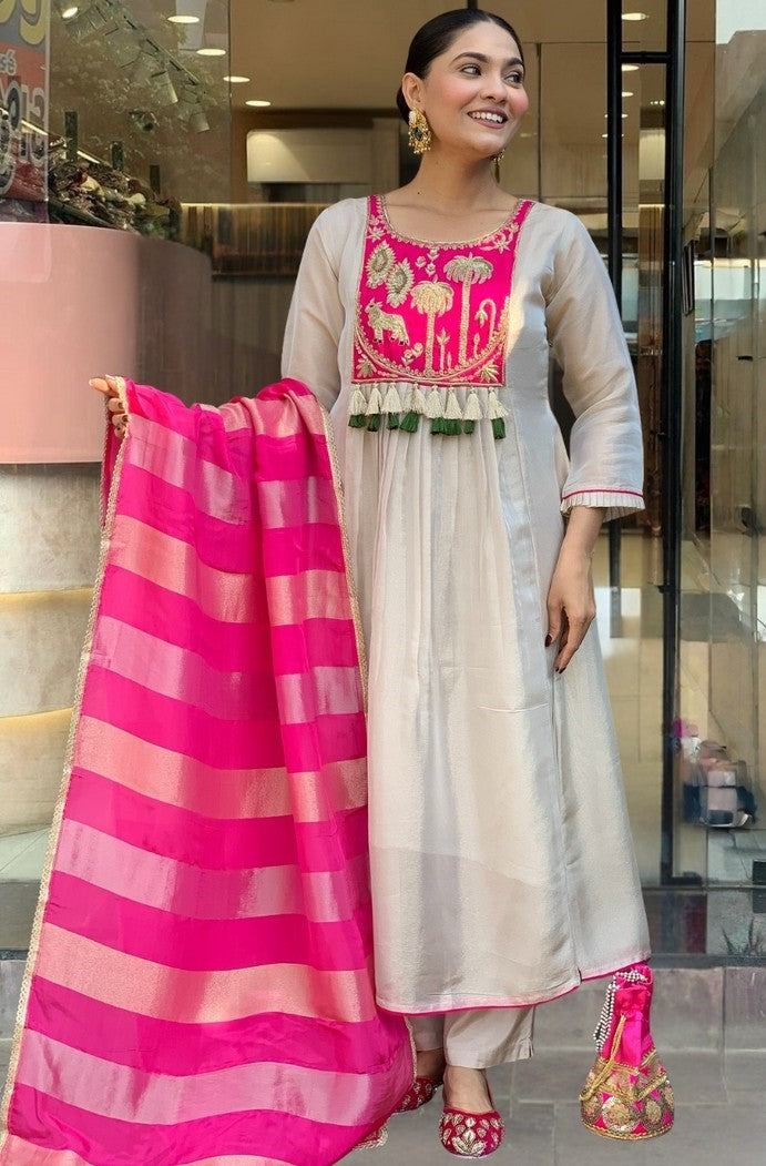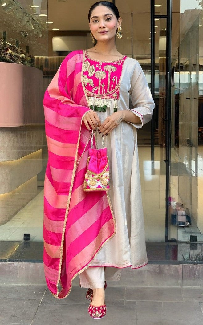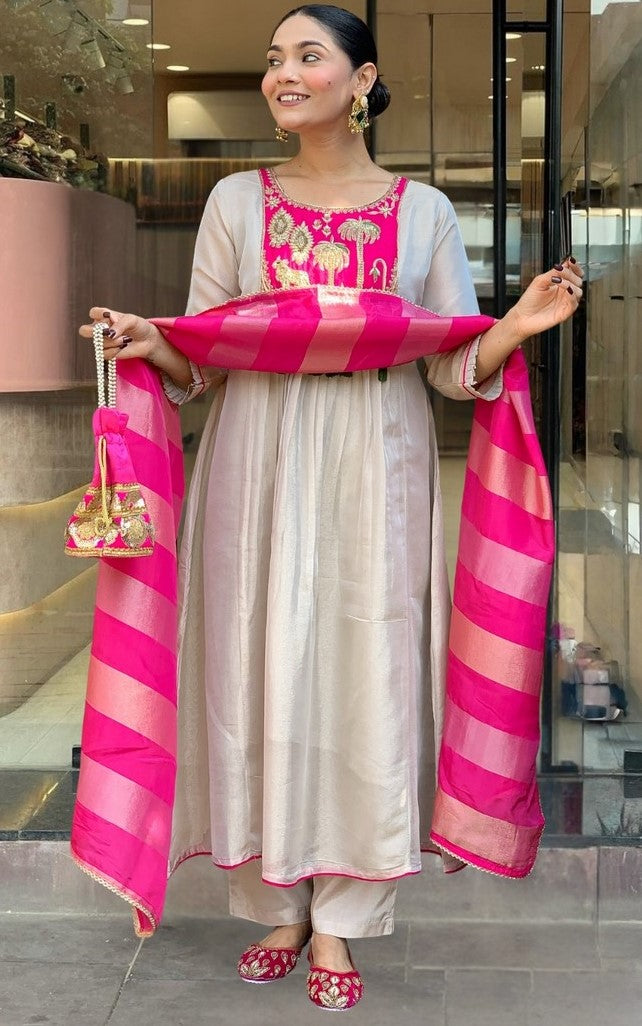 Tasteful Pink Color Silk Fabric Designer Suit