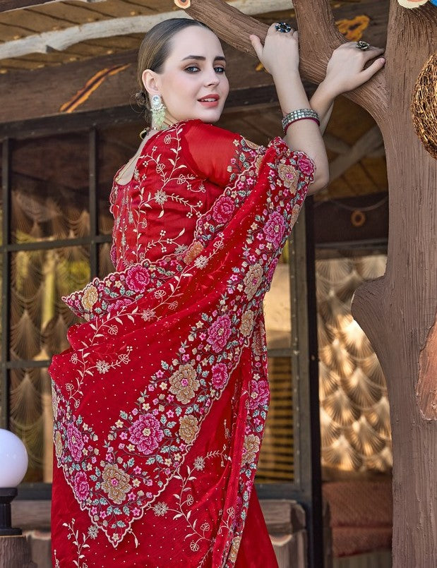 Looking These Party Wear Saree in Fine Colored.These Saree and Blouse are Burbury Silk (Jimmy Chu Silk).Its Beautified Heavy Resham Cross Stitch Embroidery Work Silver Color hot fix Siroski Work .