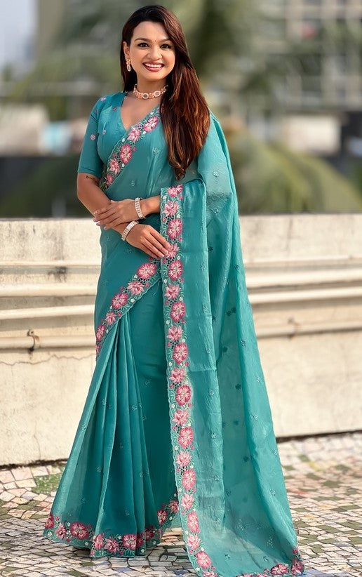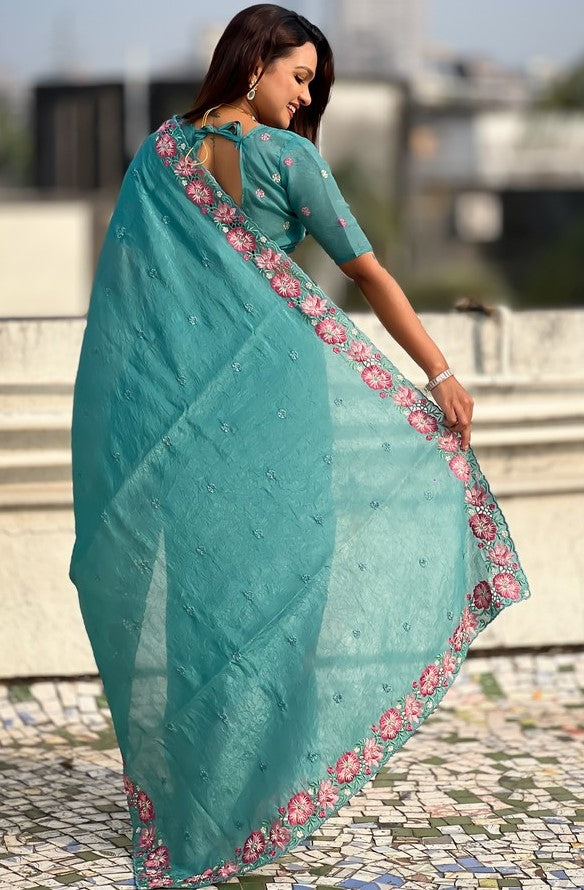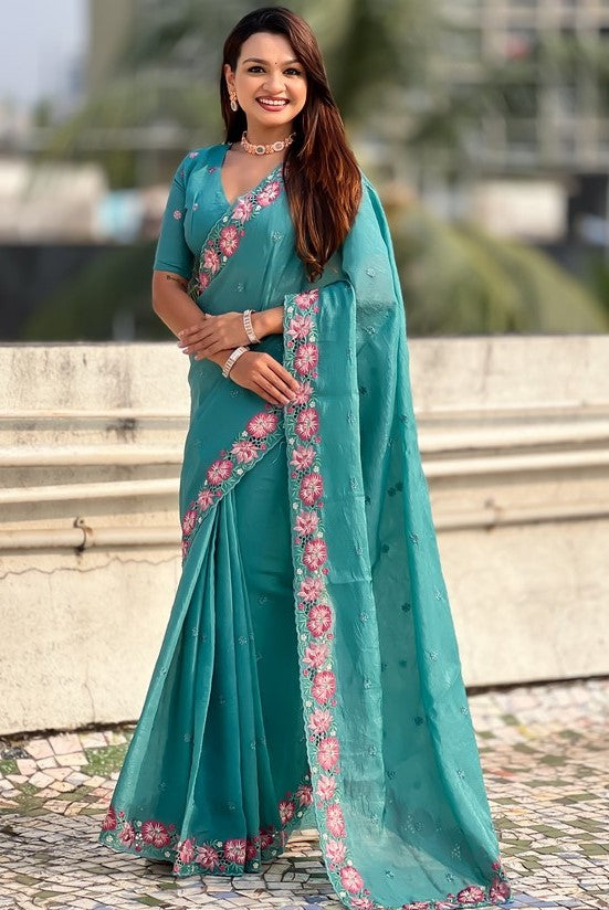 Beautiful Aqua Color Silk Fabric Designer Saree